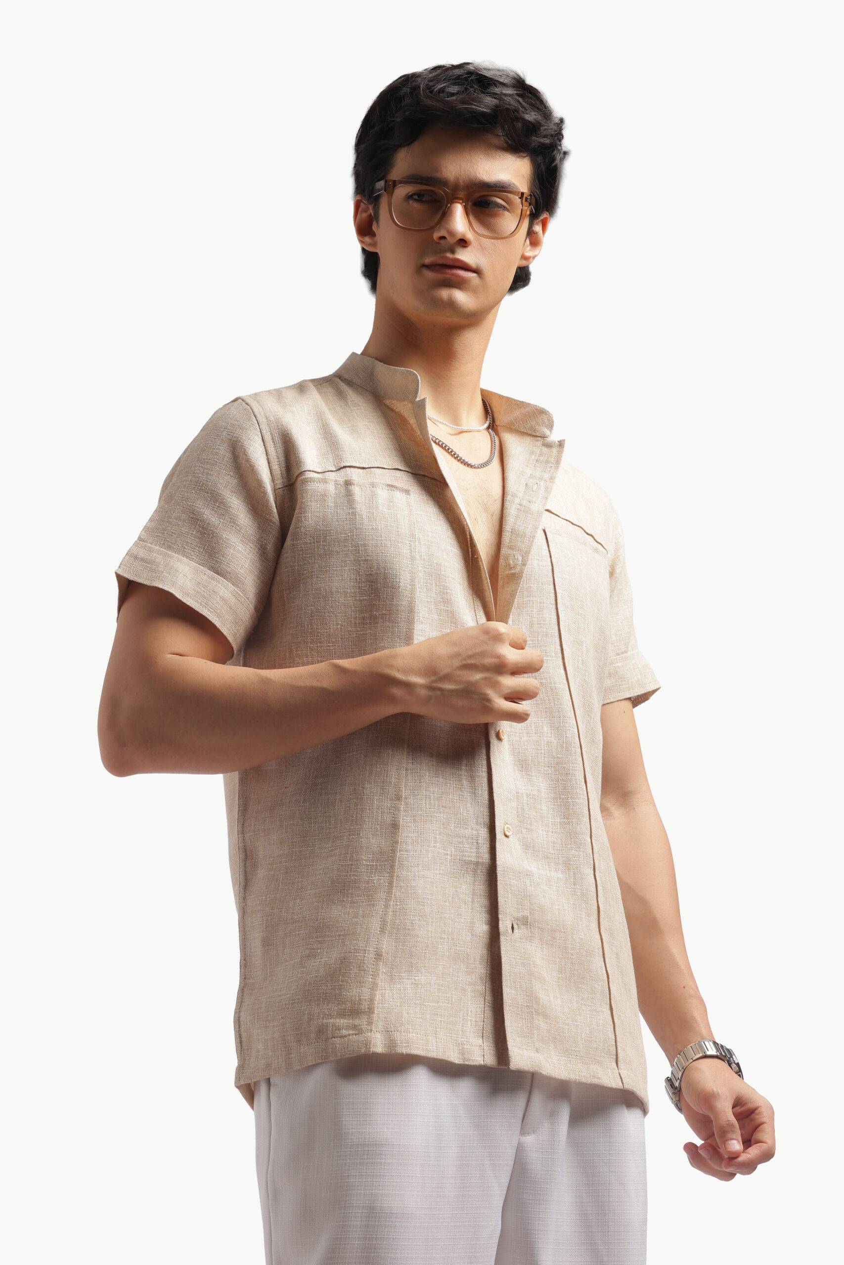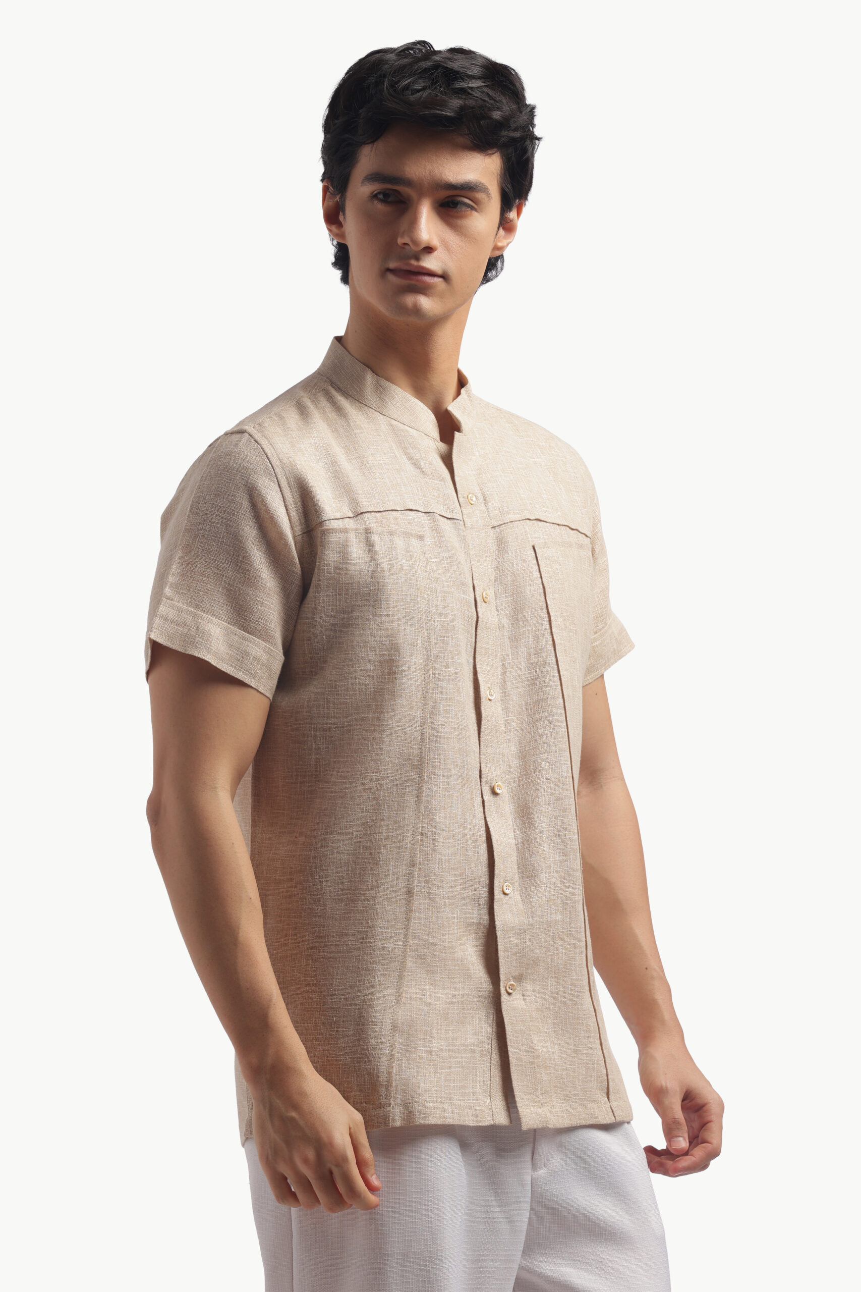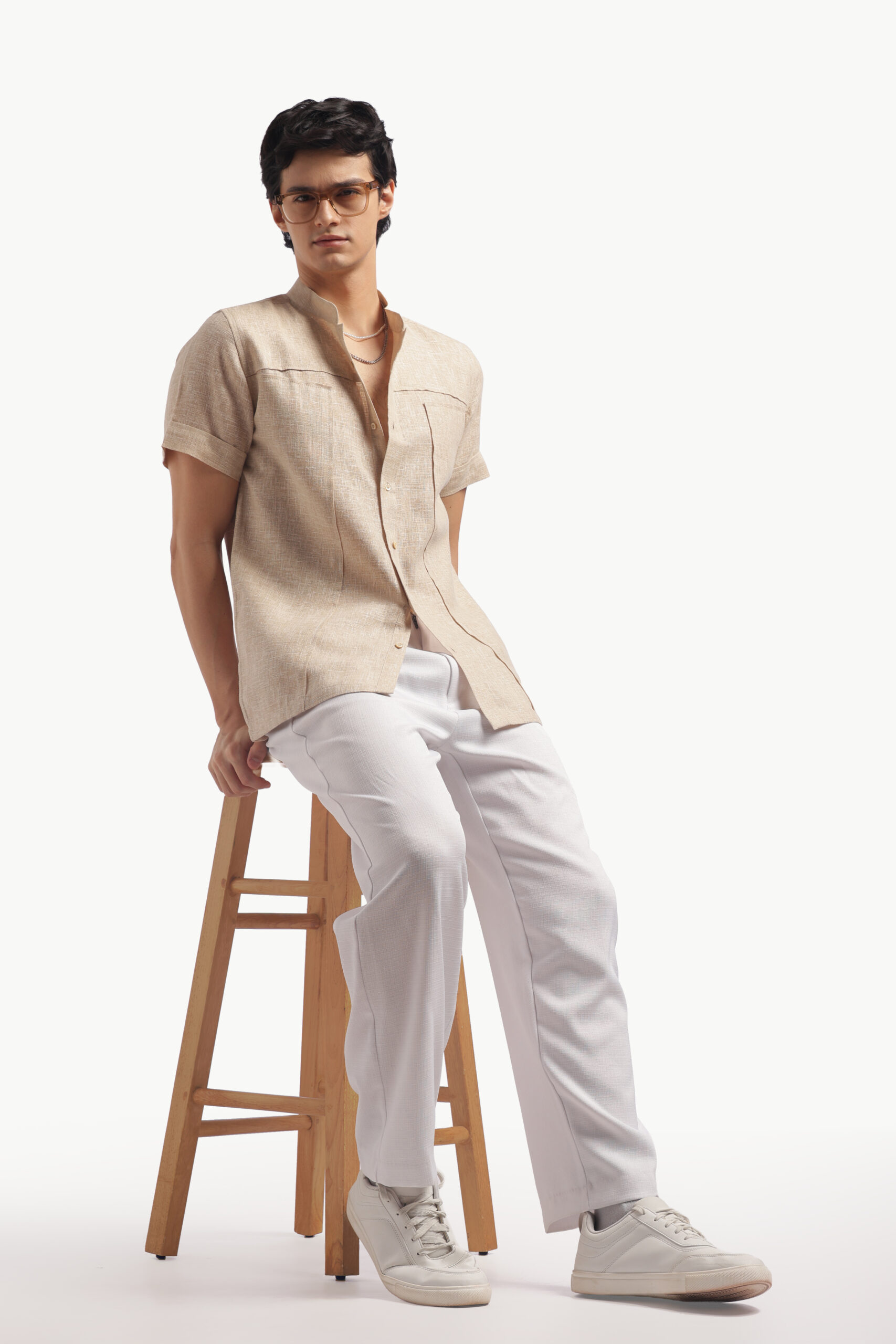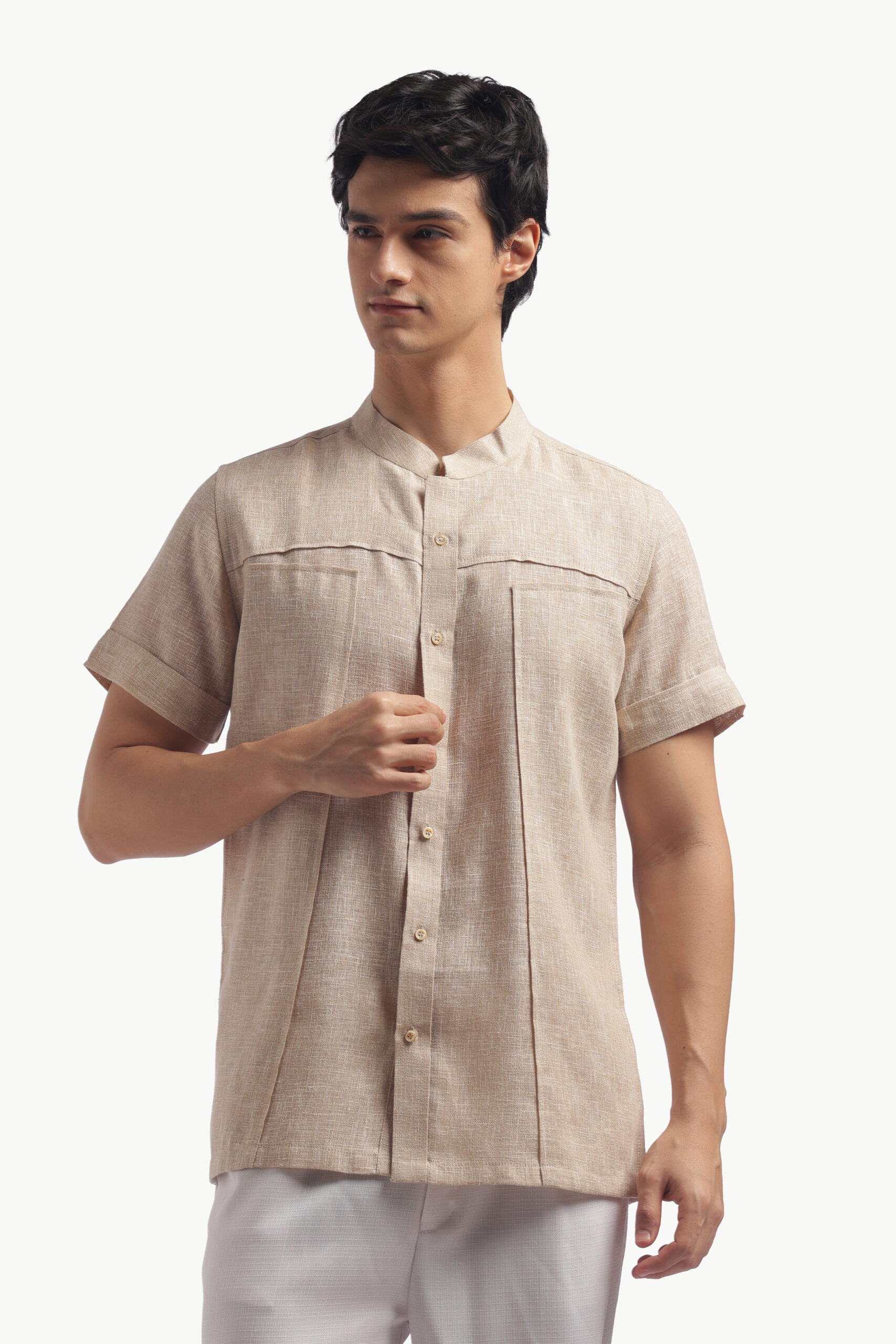 “Set the brunch tone with this easy-going yet stylish light beige shirt. It is relaxed in fit and constructed with a band collar and standard button placket giving it a classic feel. The horizontal panel detailing across the chest gives it a subtle sophistication, while the pleats on either side of the placket help accentuate the waistline. The structured back yoke design seals the deal, allowing you to enjoy a day out stylish yet relaxed. A comfort zone, classic, and versatile, this shirt is an easy option for relaxed sophistication. Care: Dry clean only. Lowest heat steam iron preferred.”