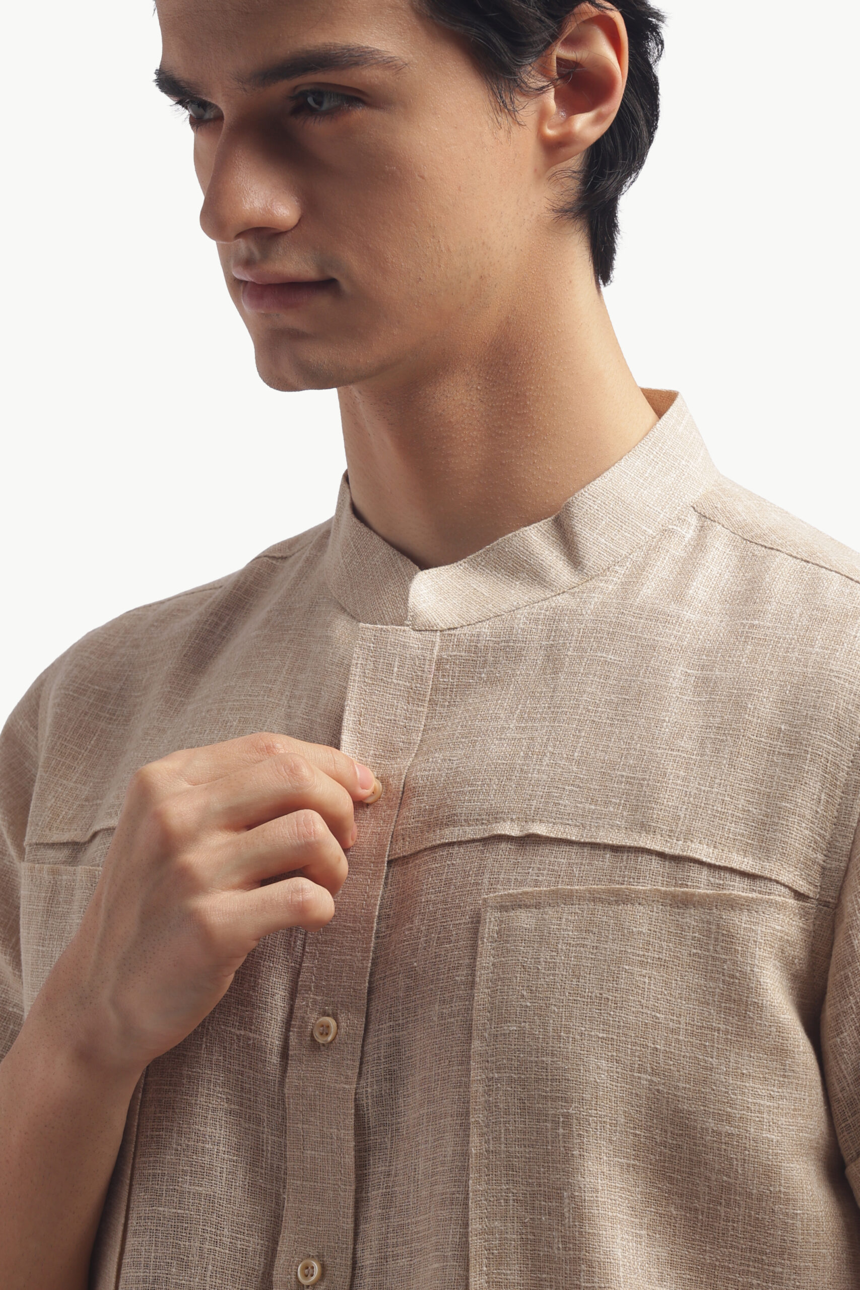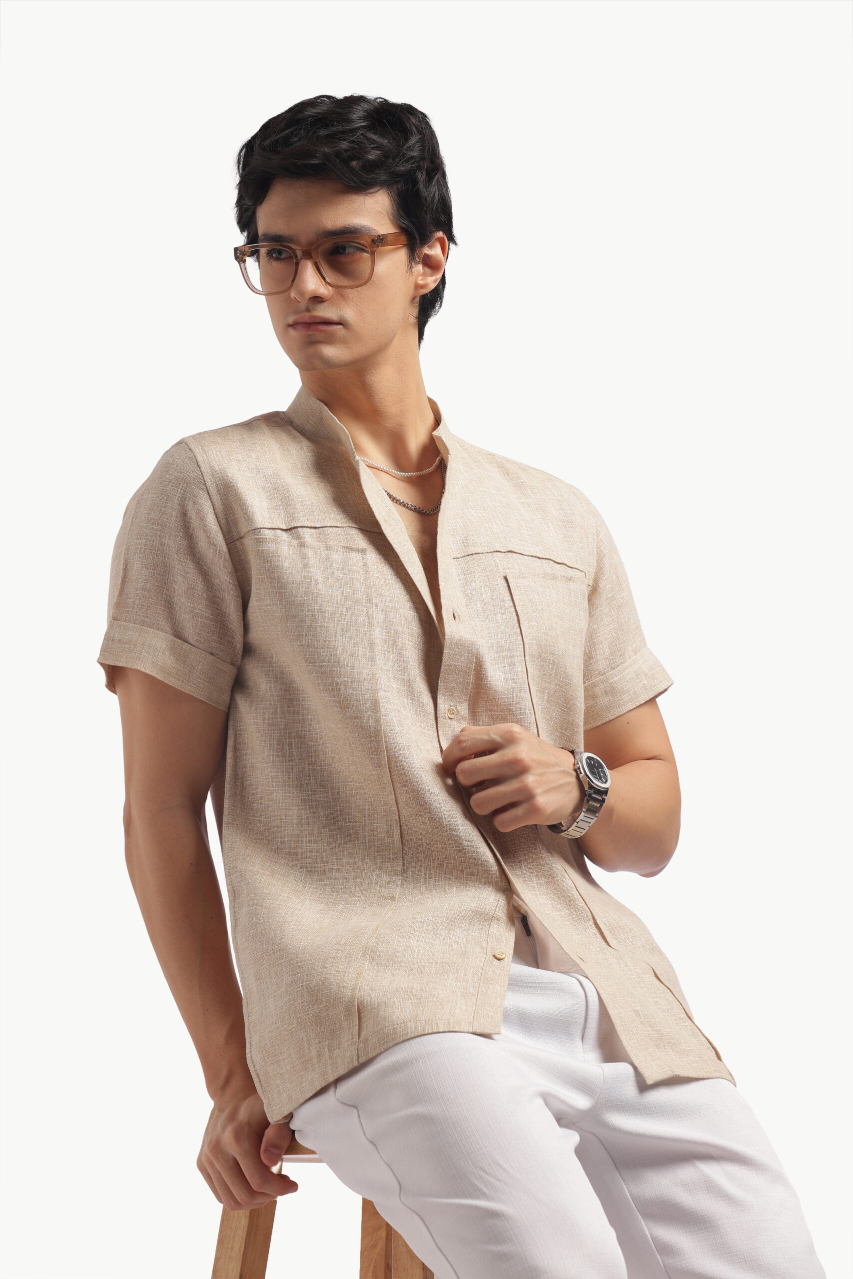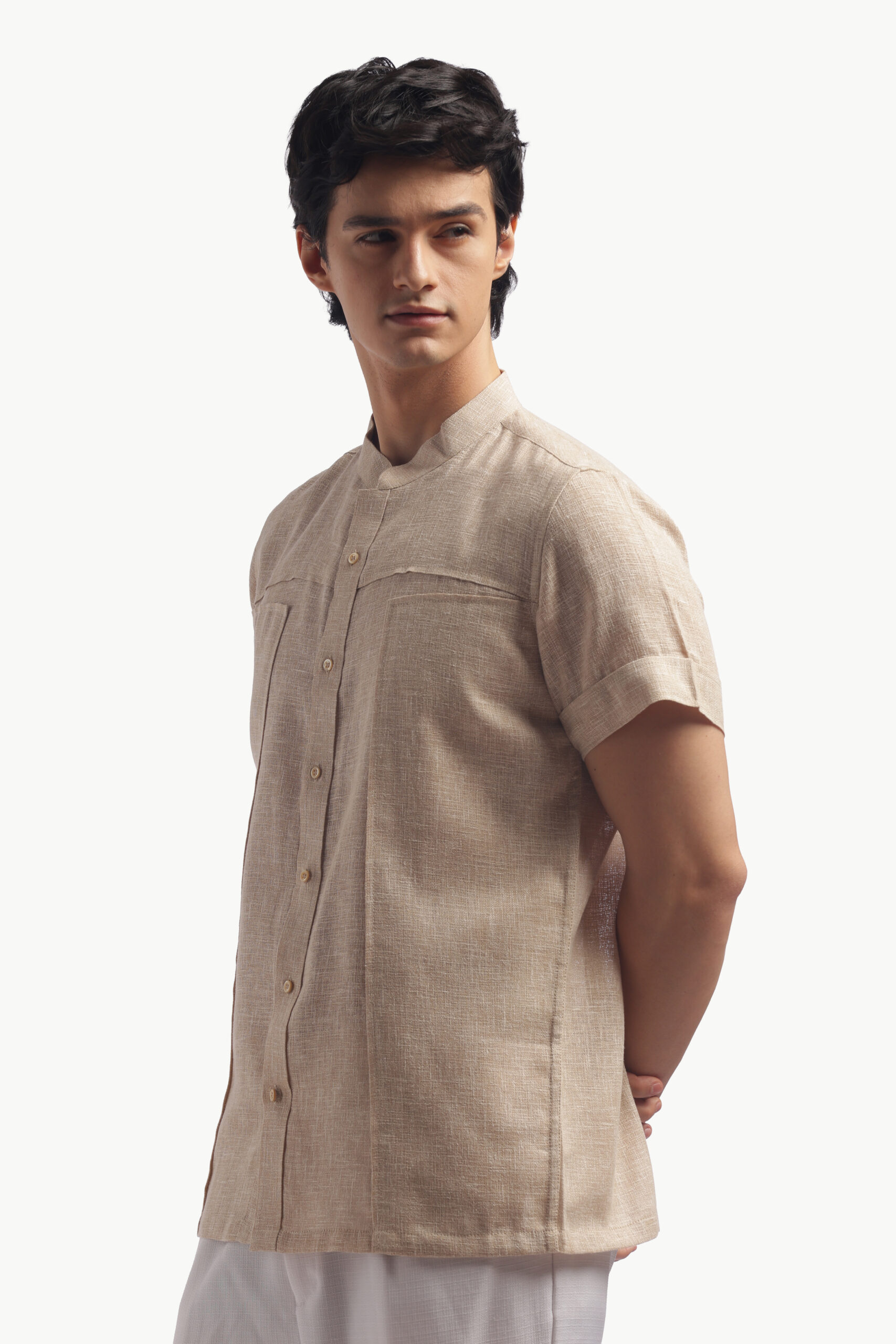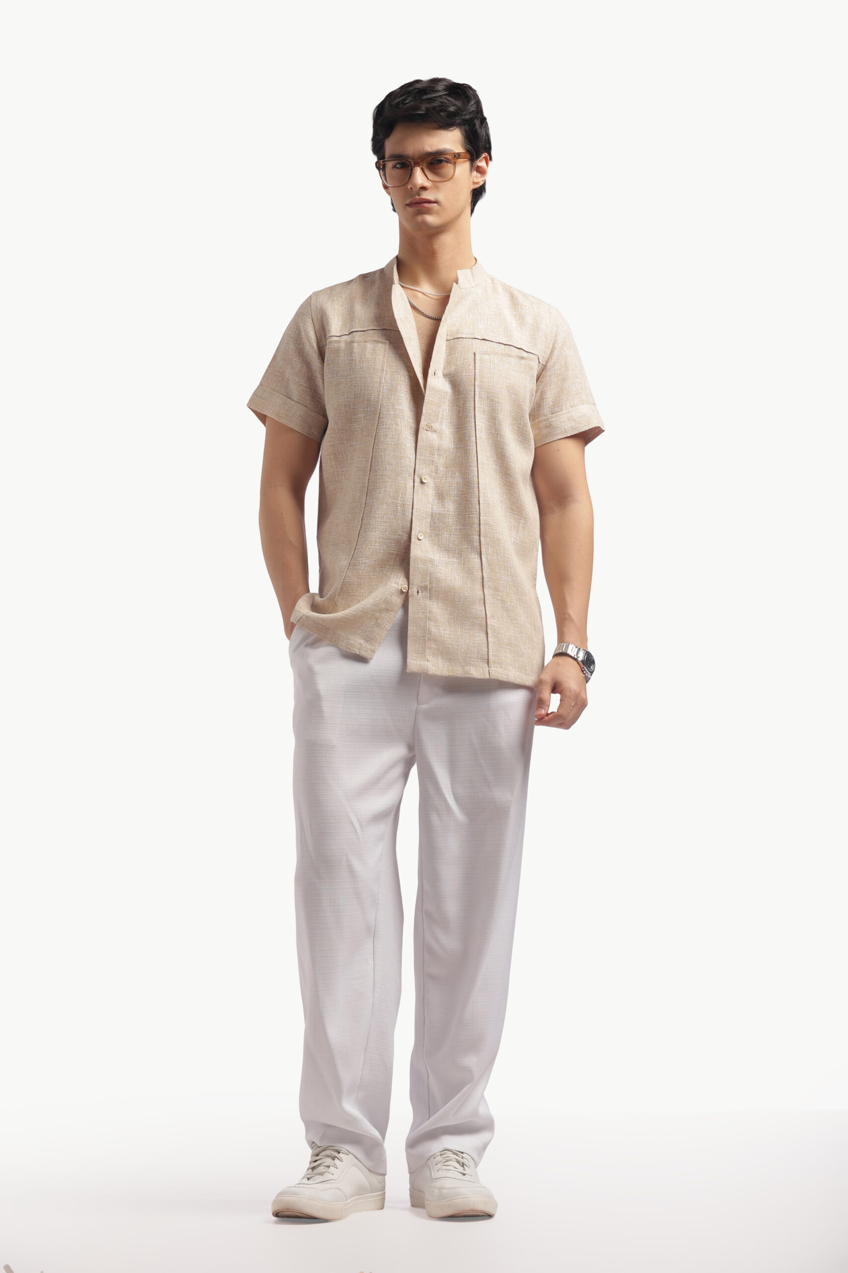 “Set the brunch tone with this easy-going yet stylish light beige shirt. It is relaxed in fit and constructed with a band collar and standard button placket giving it a classic feel. The horizontal panel detailing across the chest gives it a subtle sophistication, while the pleats on either side of the placket help accentuate the waistline. The structured back yoke design seals the deal, allowing you to enjoy a day out stylish yet relaxed. A comfort zone, classic, and versatile, this shirt is an easy option for relaxed sophistication. Care: Dry clean only. Lowest heat steam iron preferred.”