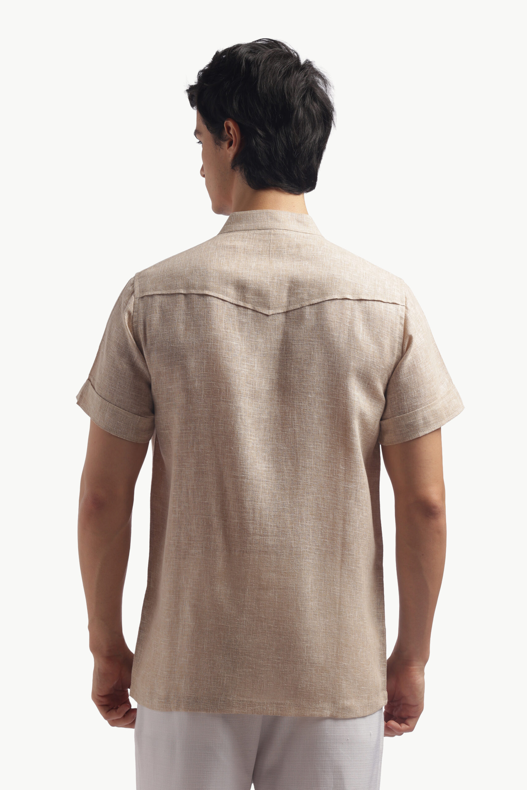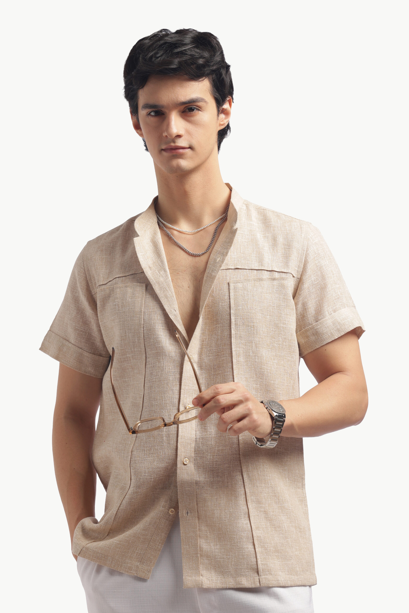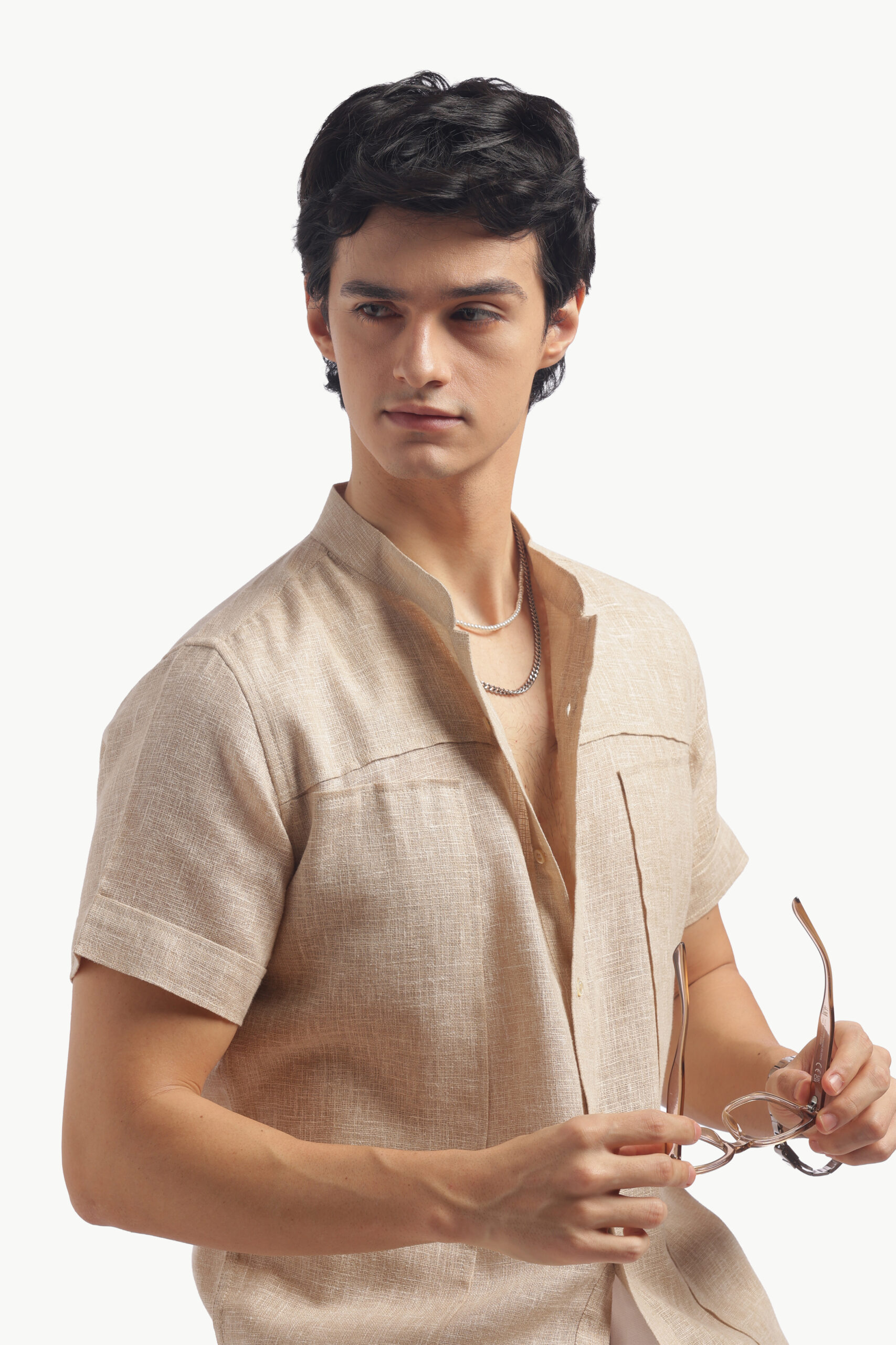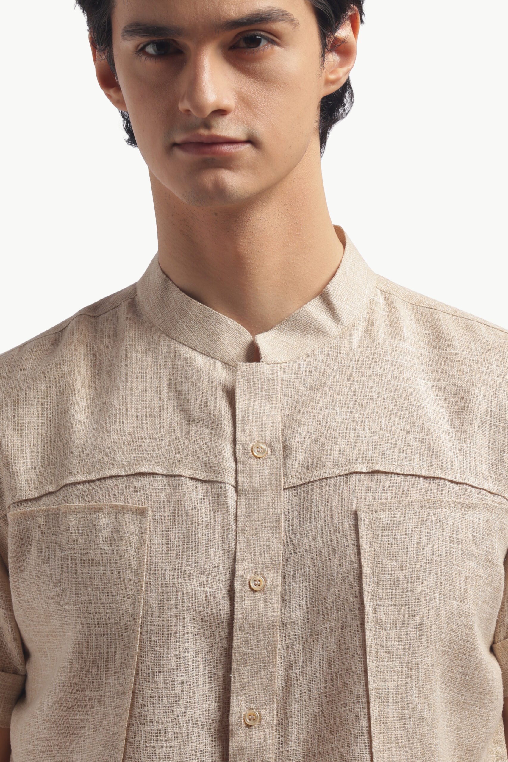 “Set the brunch tone with this easy-going yet stylish light beige shirt. It is relaxed in fit and constructed with a band collar and standard button placket giving it a classic feel. The horizontal panel detailing across the chest gives it a subtle sophistication, while the pleats on either side of the placket help accentuate the waistline. The structured back yoke design seals the deal, allowing you to enjoy a day out stylish yet relaxed. A comfort zone, classic, and versatile, this shirt is an easy option for relaxed sophistication. Care: Dry clean only. Lowest heat steam iron preferred.”