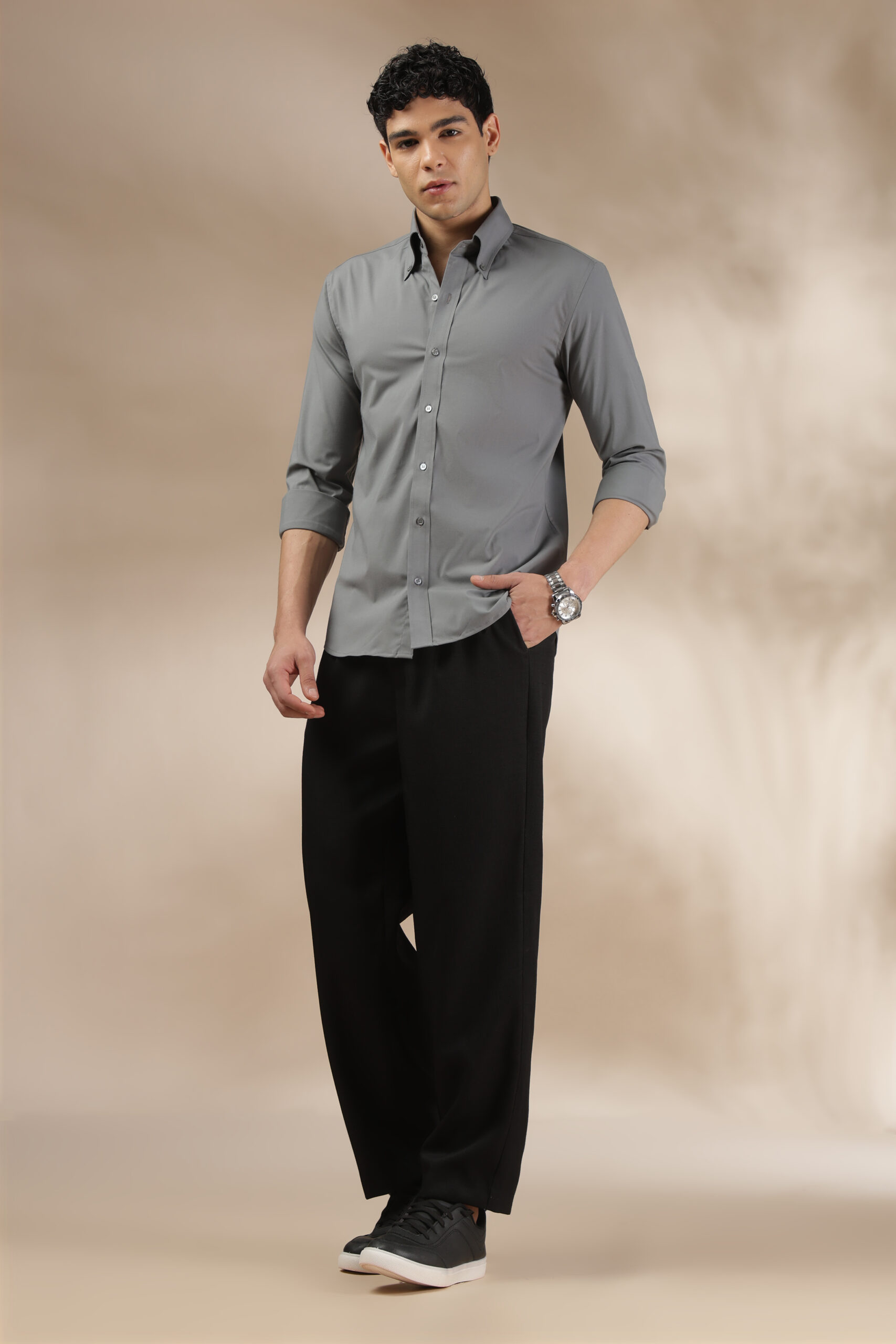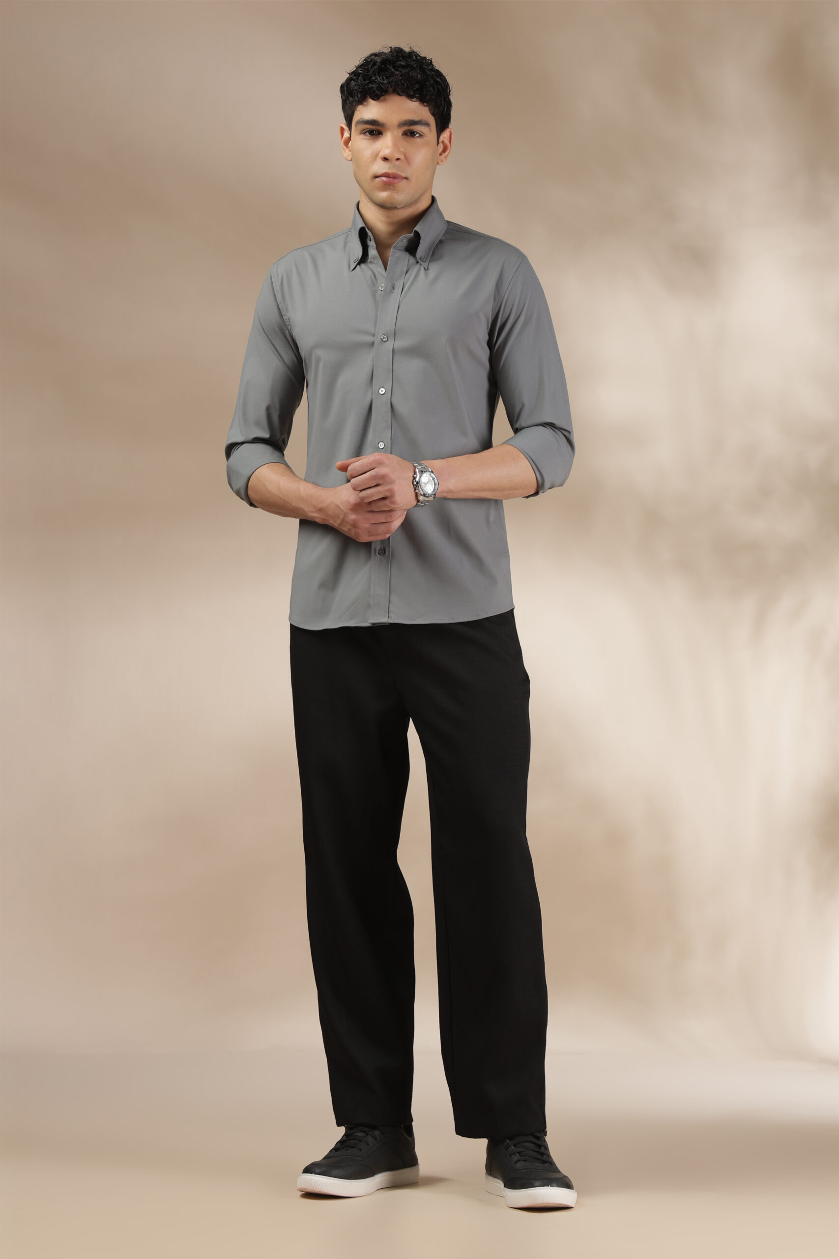 Take your workwear to the next level with our 9to5 Muscle Fit Shirt in Charcoal Grey. Made from an imported plain Lycra fabric for comfort and a polished feel, this shirt features a slim fit which is the perfect fit for the professional today. The shirt features a button-down collar, barrel cuffs with a single button closure and a standard front button placket , designed for a classic look or a casual look. Whether just doing work tasks or a post-work occasion, the full sleeve shirt always keeps you looking clean and fresh throughout the day. Care: Dry clean only. Lowest heat steam iron preferred.