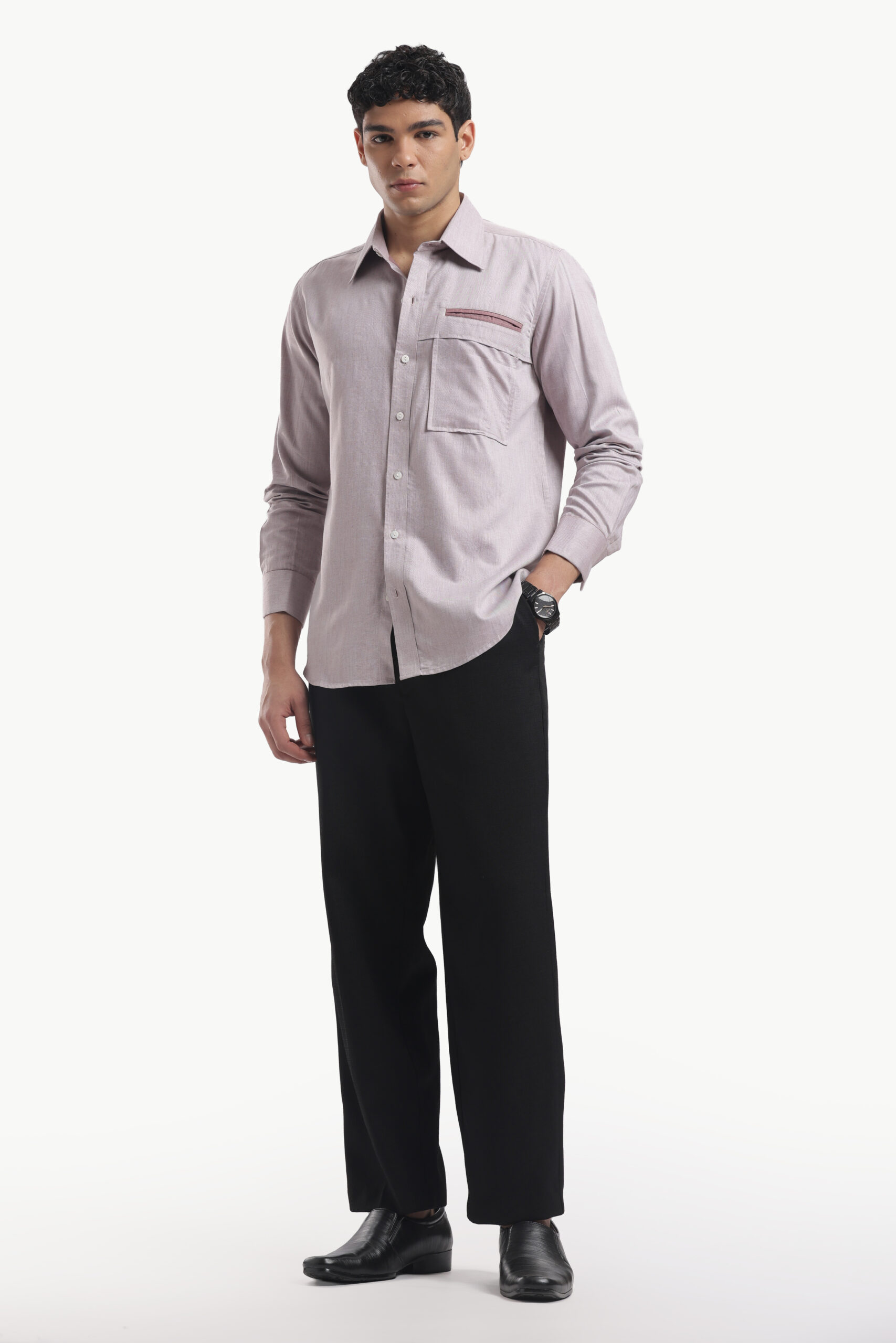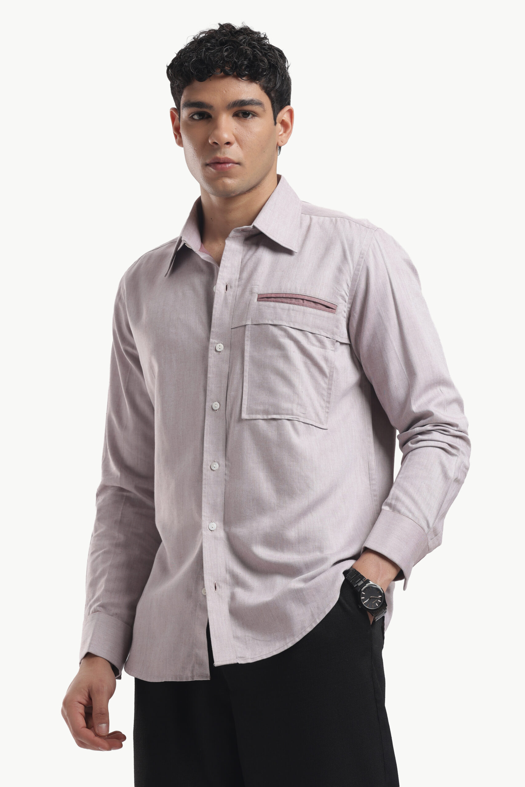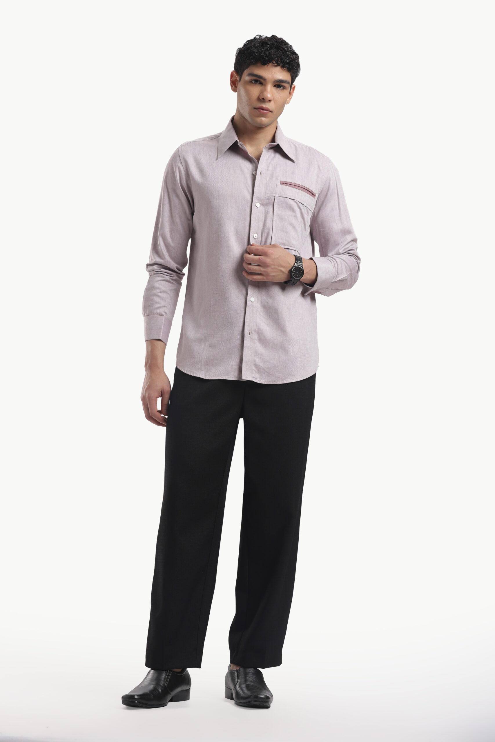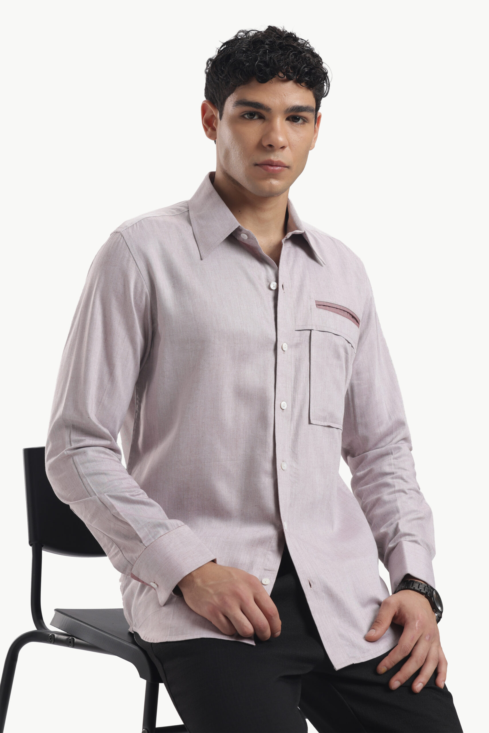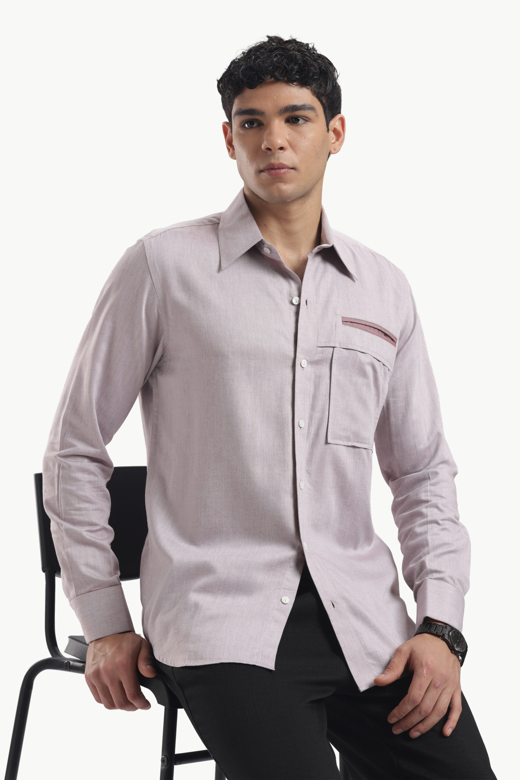 A sophisticated update to your weekday rotation, this Dusty Rose Gold shirt is designed for the man who values subtlety with detail. Cut from a breathable, lightweight weave with a gentle sheen, the shirt features a sharp spread collar, sleek front placket, and a chest pocket enhanced with a tonal horizontal trim. The inner collar lining and button thread detailing echo a refined contrast, while the tailored fit ensures a crisp silhouette. Finished with full sleeves and button cuffs, it’s ideal for desk-to-dinner transitions or a polished weekend brunch look.