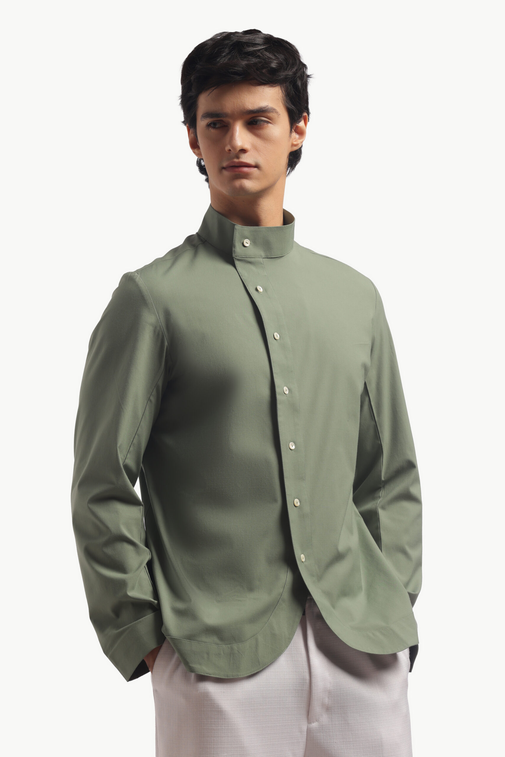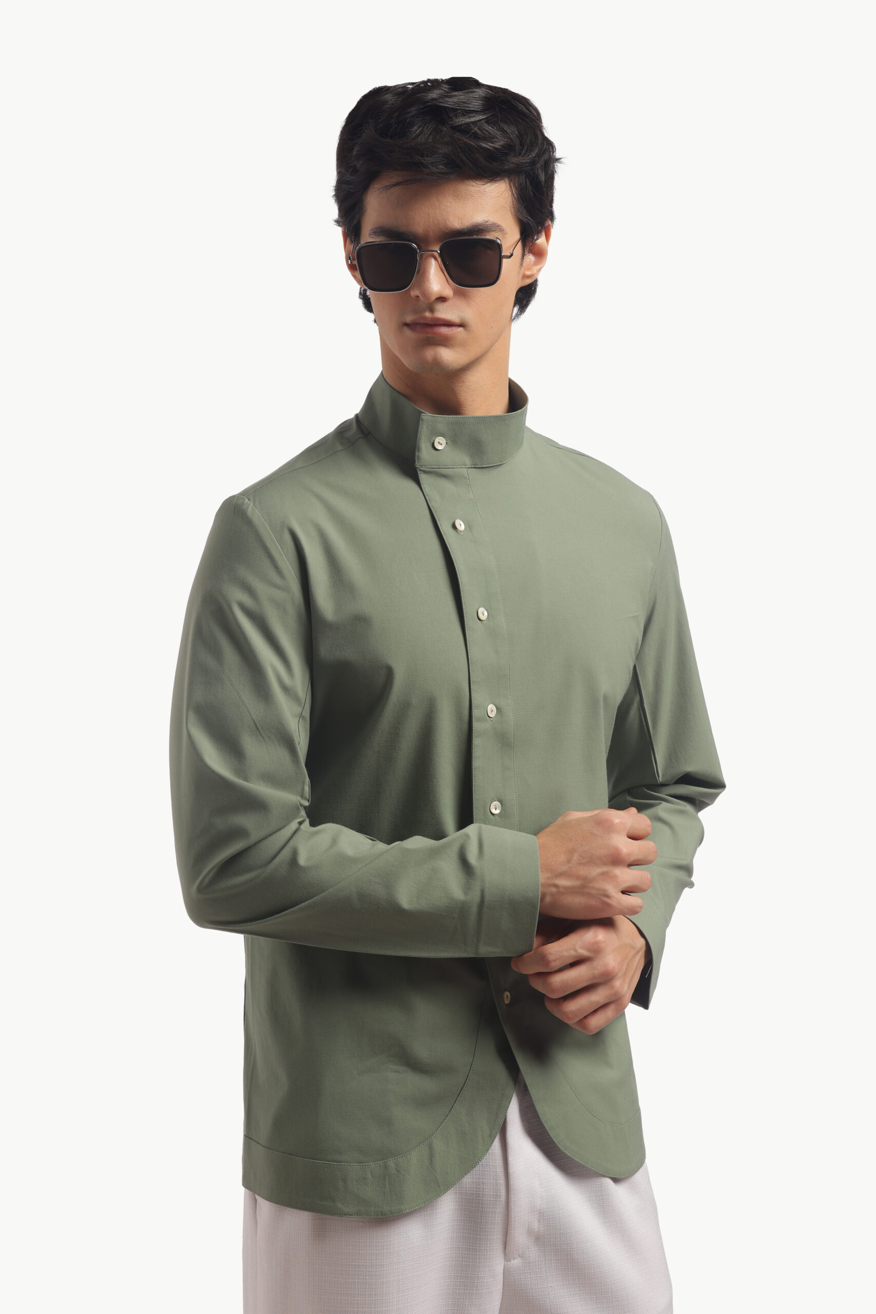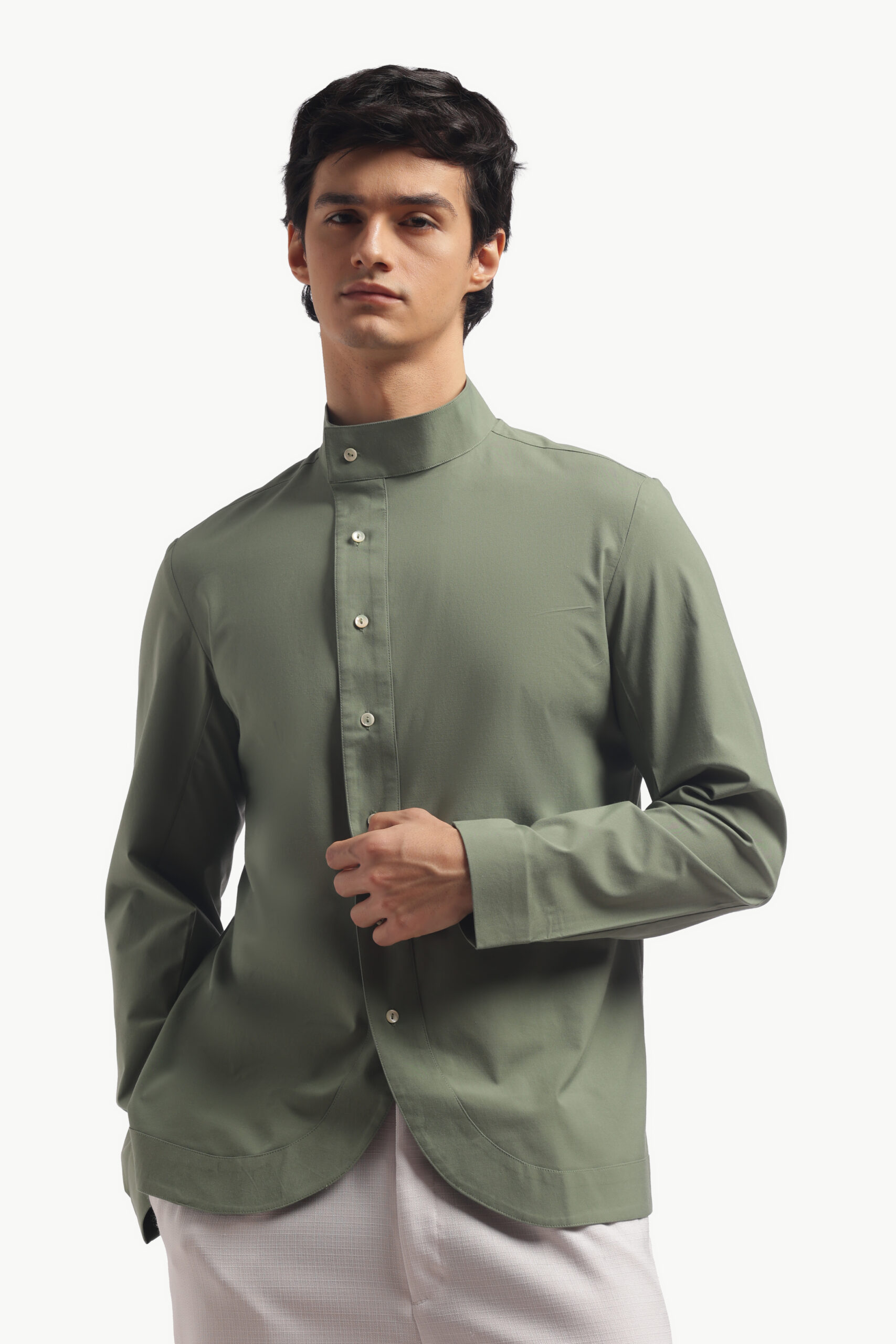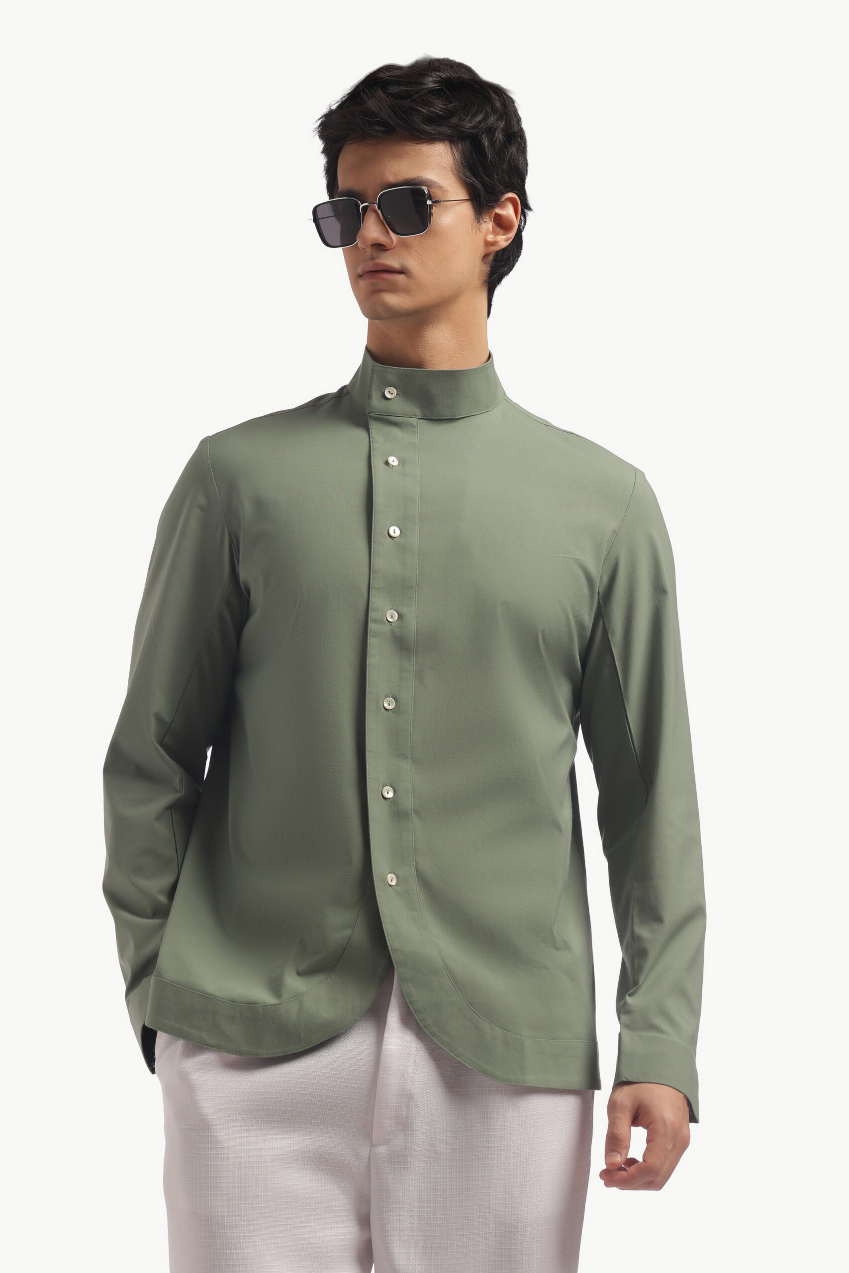 “Effortless Chic is showcased in this modern contemporary design with understated elegance in muted green. This easy to wear top is made from imported plain lycra and its relaxed fit will keep you comfortable. The mandarin collar and sleeves add a sophistication to this elegant piece. The standard button placket and a chic tulip type hemline complete the elevated refined look. The back construction will prove to be neat modern piece. For those who prefer producing a more “”no fuss”” look, this would suit easier casual or dressy occasion. Care: Dry clean only. Lowest heat steam iron preferred.”