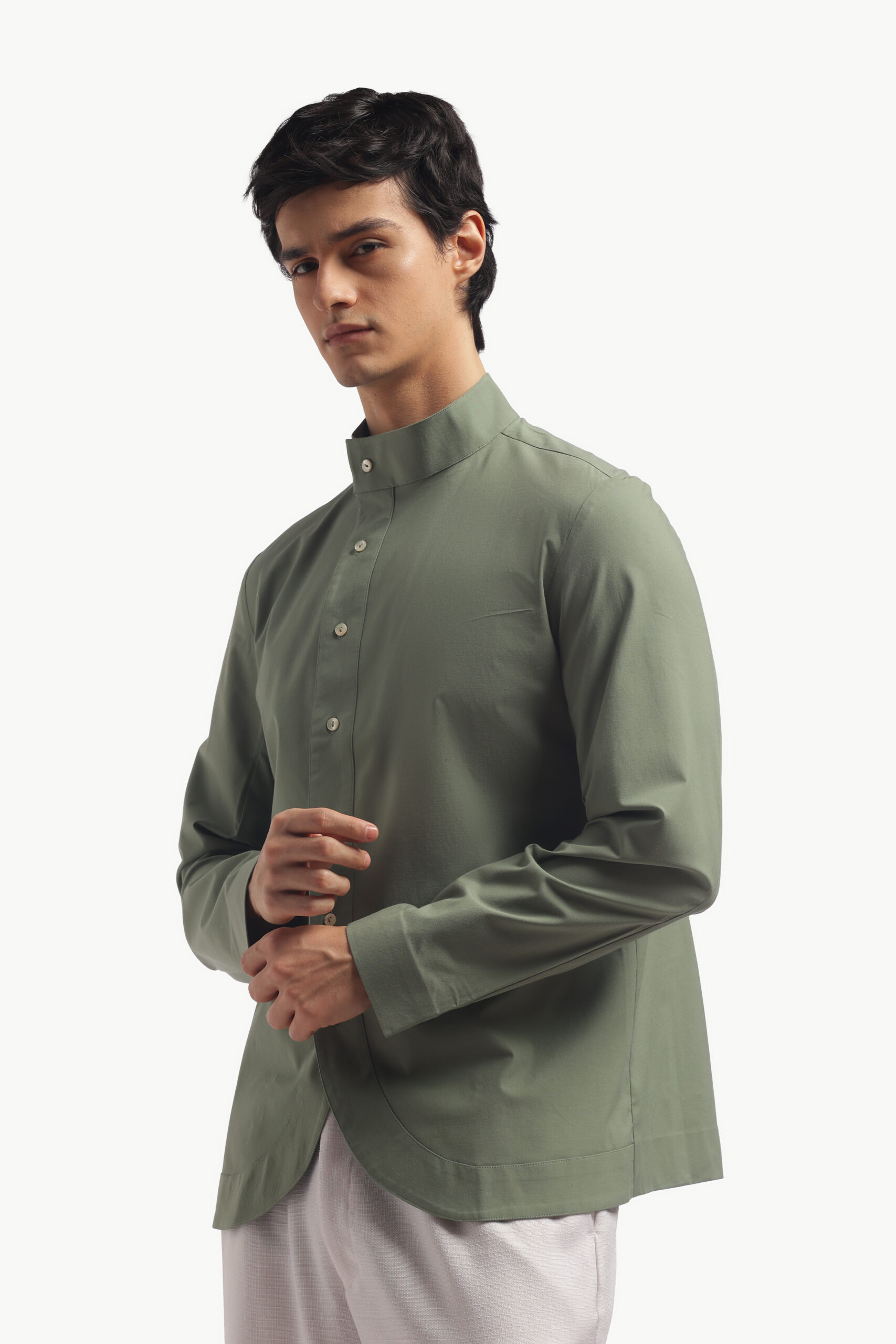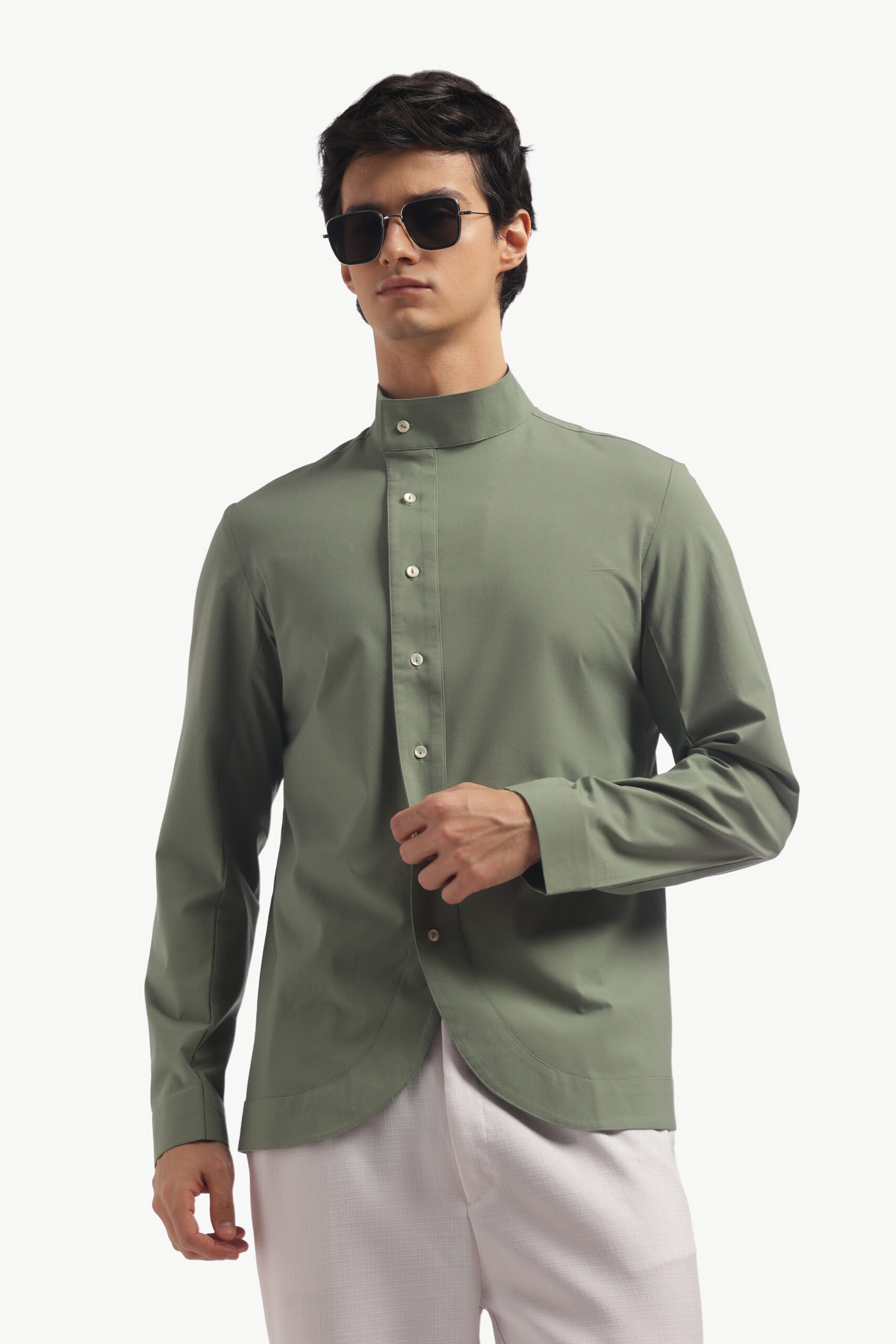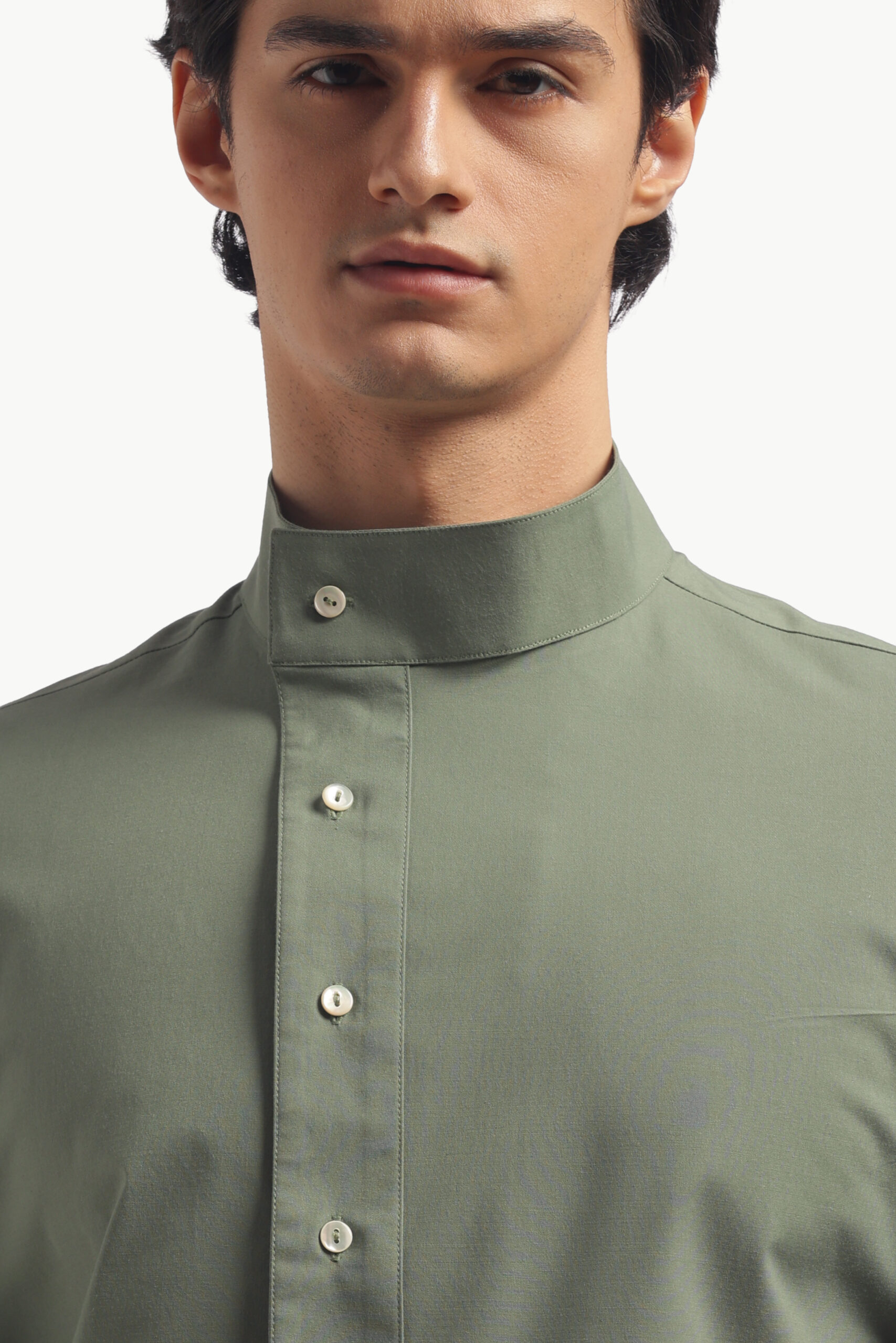 “Effortless Chic is showcased in this modern contemporary design with understated elegance in muted green. This easy to wear top is made from imported plain lycra and its relaxed fit will keep you comfortable. The mandarin collar and sleeves add a sophistication to this elegant piece. The standard button placket and a chic tulip type hemline complete the elevated refined look. The back construction will prove to be neat modern piece. For those who prefer producing a more “”no fuss”” look, this would suit easier casual or dressy occasion. Care: Dry clean only. Lowest heat steam iron preferred.”