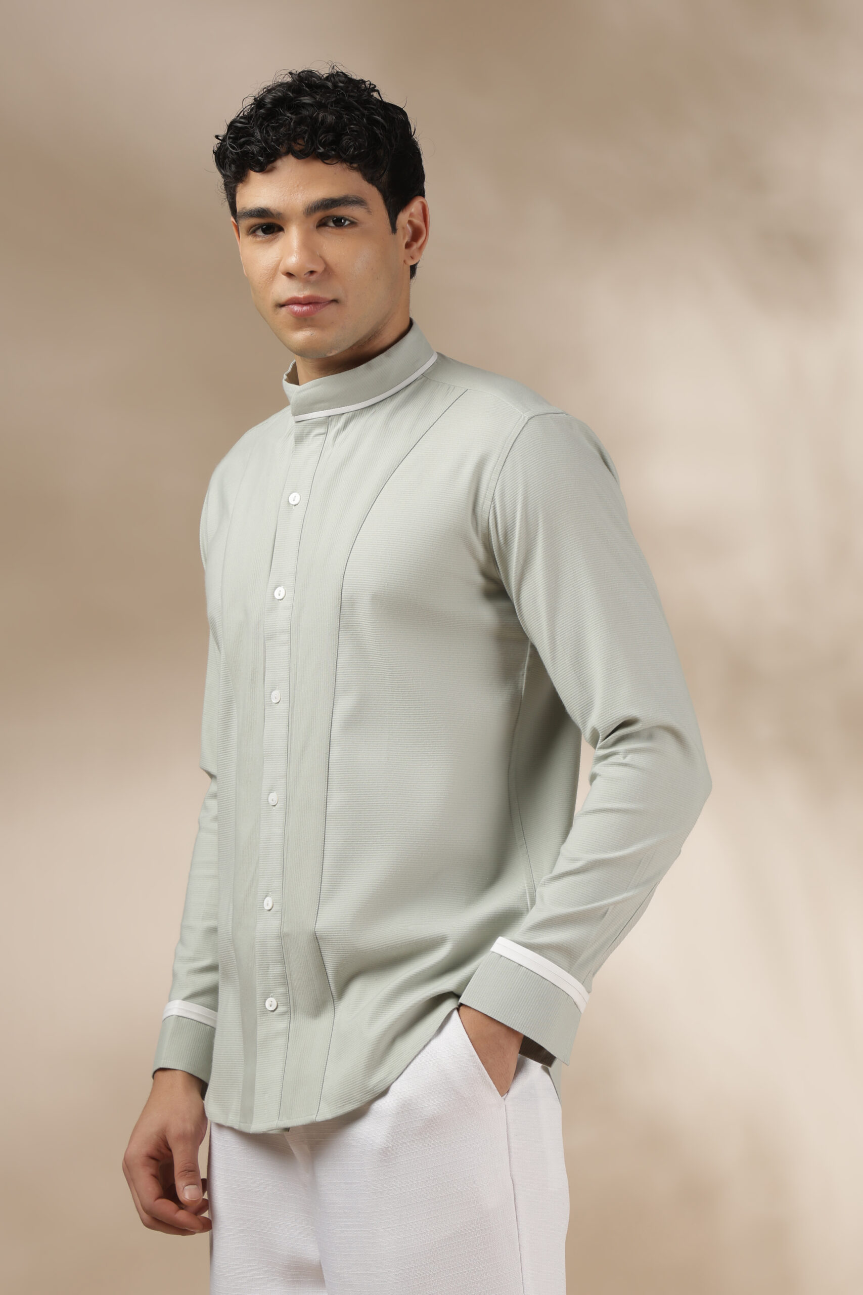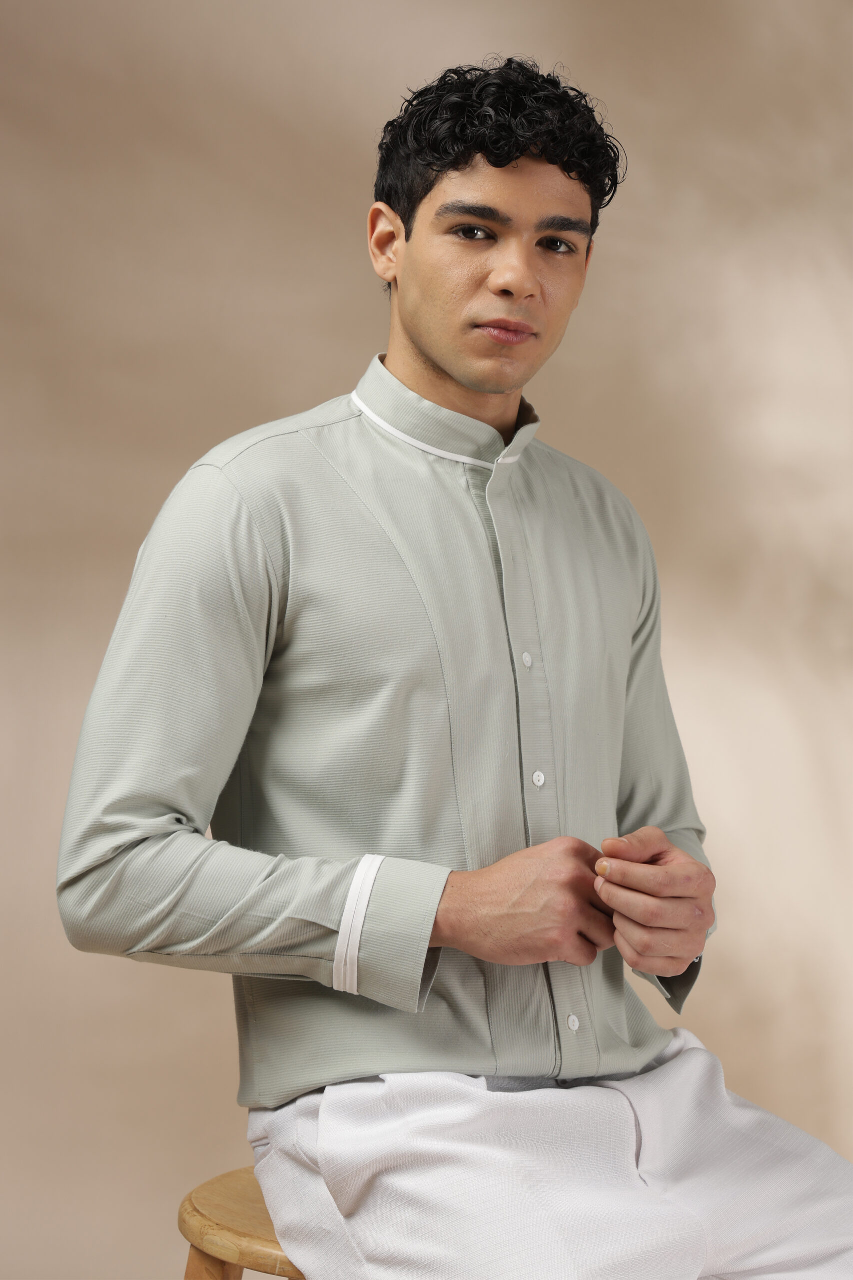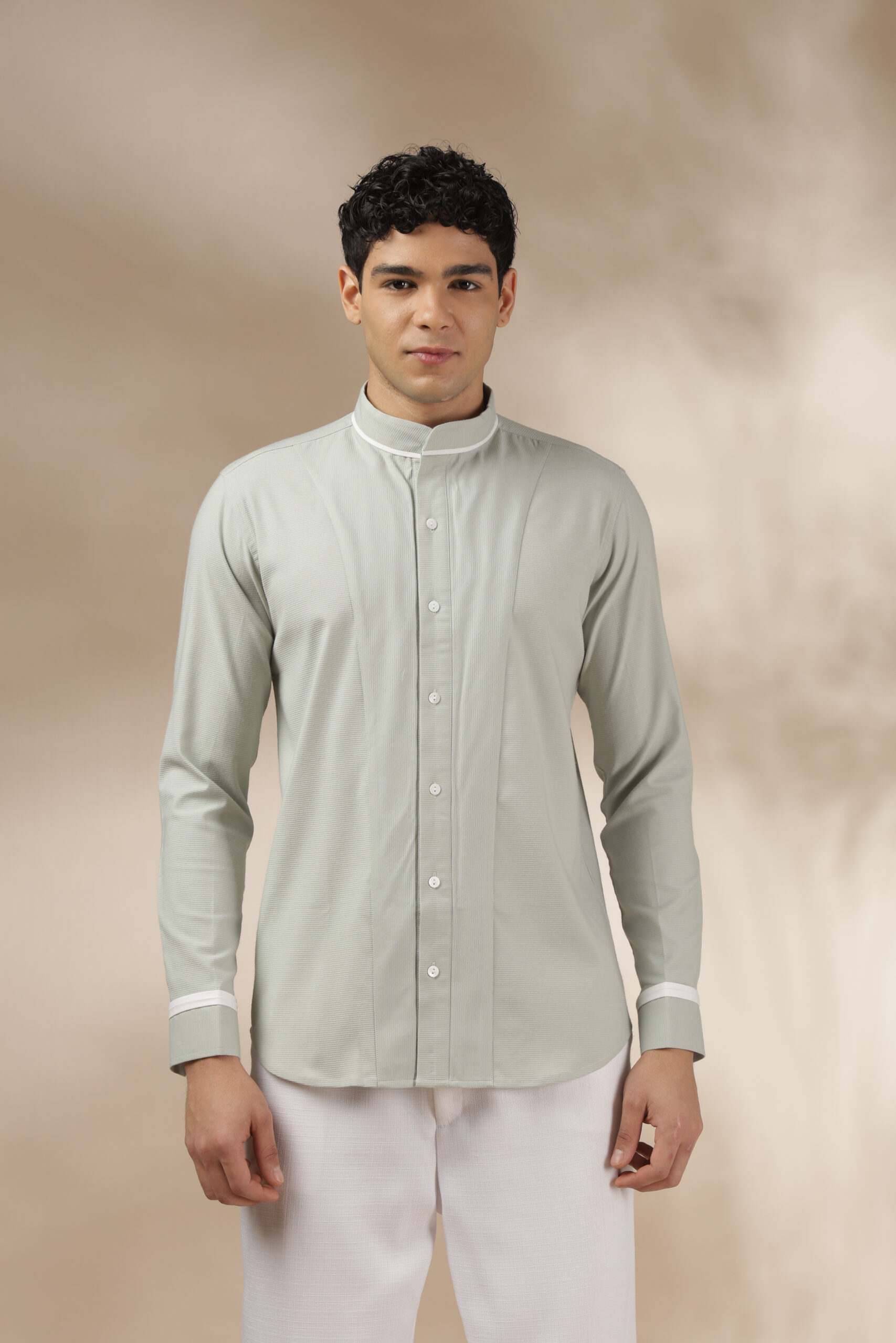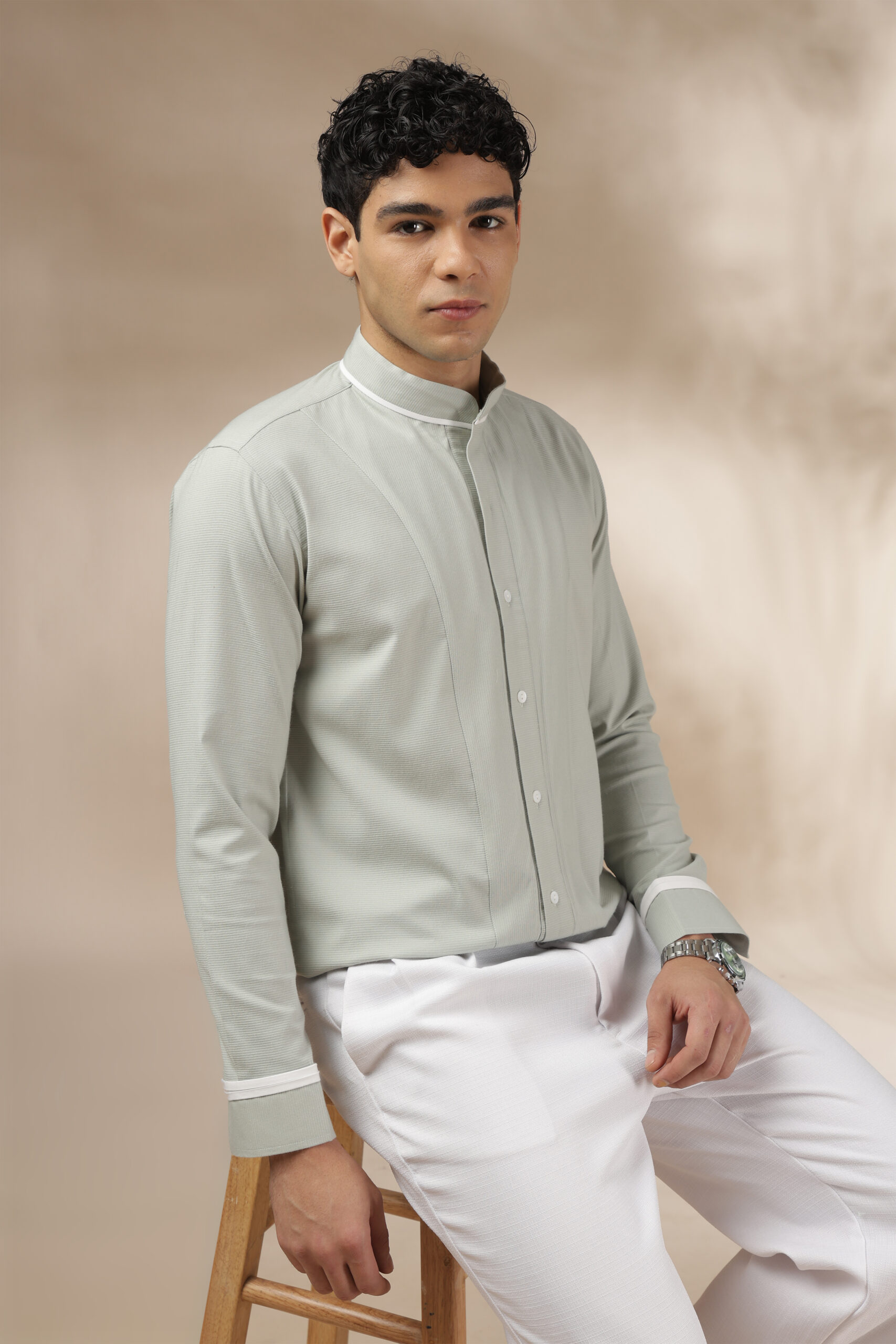 “This is the Elevated Essential Shirt from Weft Lycra for comfort throughout the day. Featuring a relaxed fit and full sleeves, a band collar, a barrel cuff, and contrast white piping. In addition, the shirt has a straight-cut yoke with a box pleat and a contrast tab extension on the cuff. The Elevated Essential Shirt is the perfect shirt for any occasion that requires effortless style. Care: Dry clean only. Lowest heat steam iron preferred.”