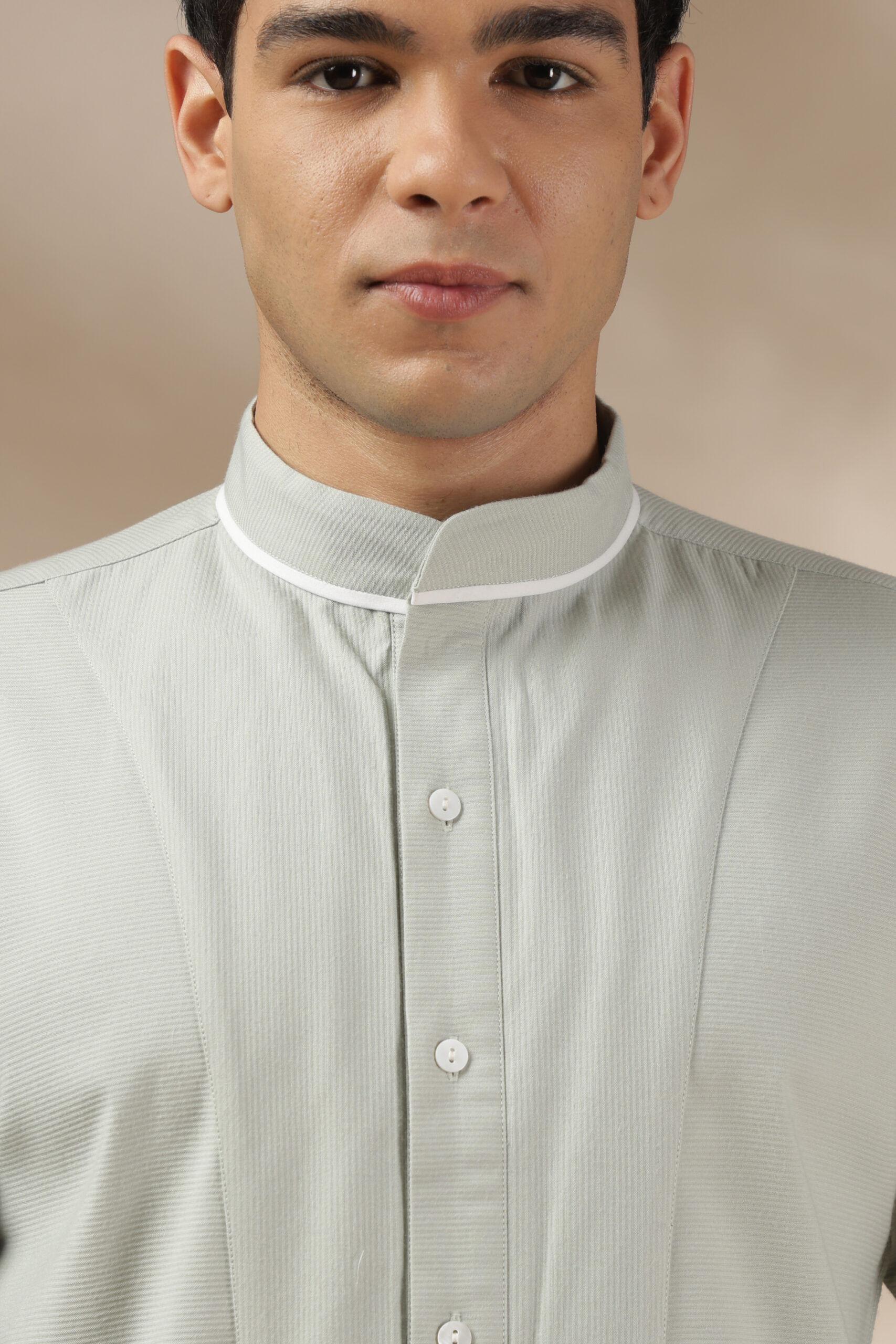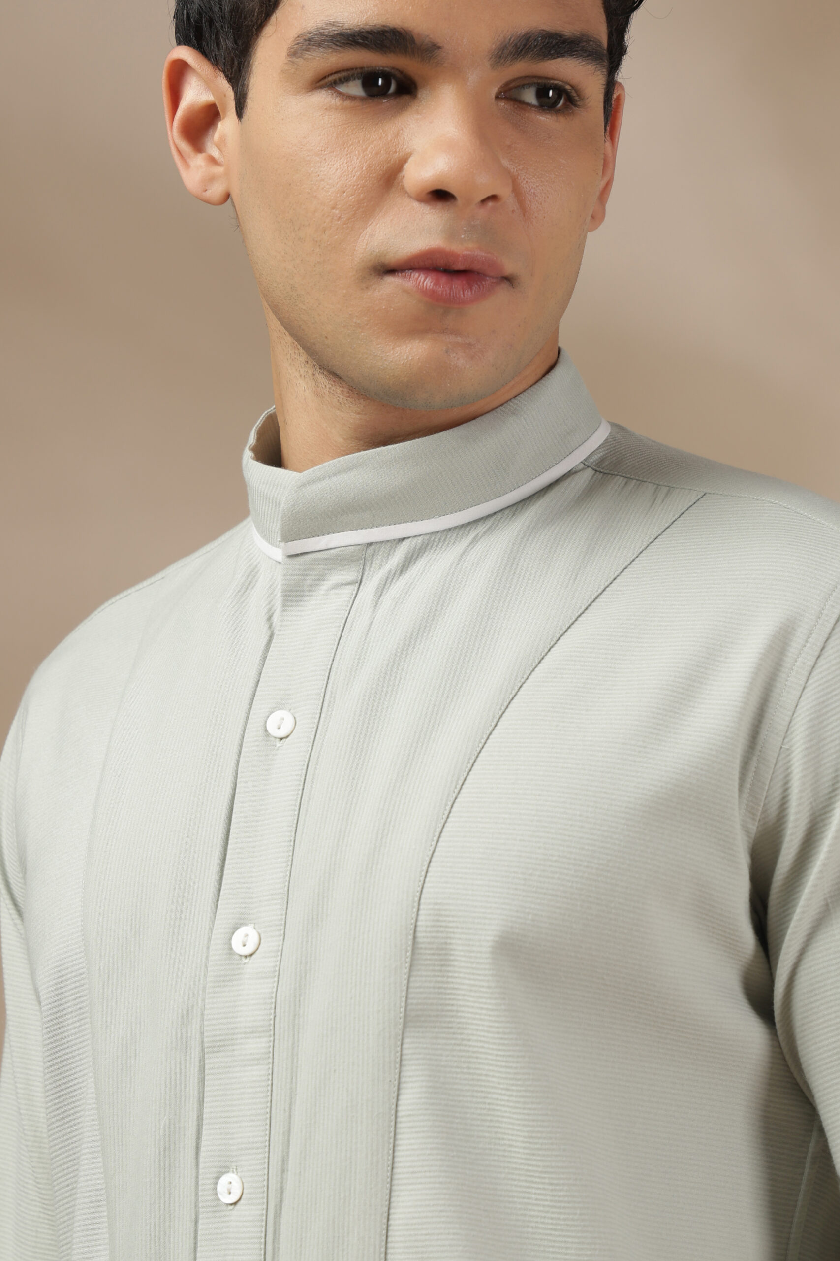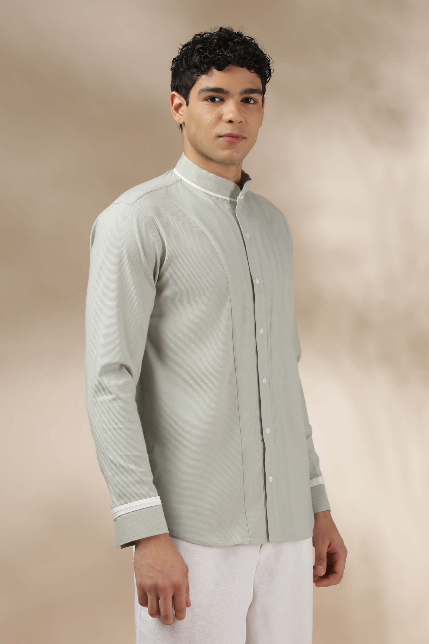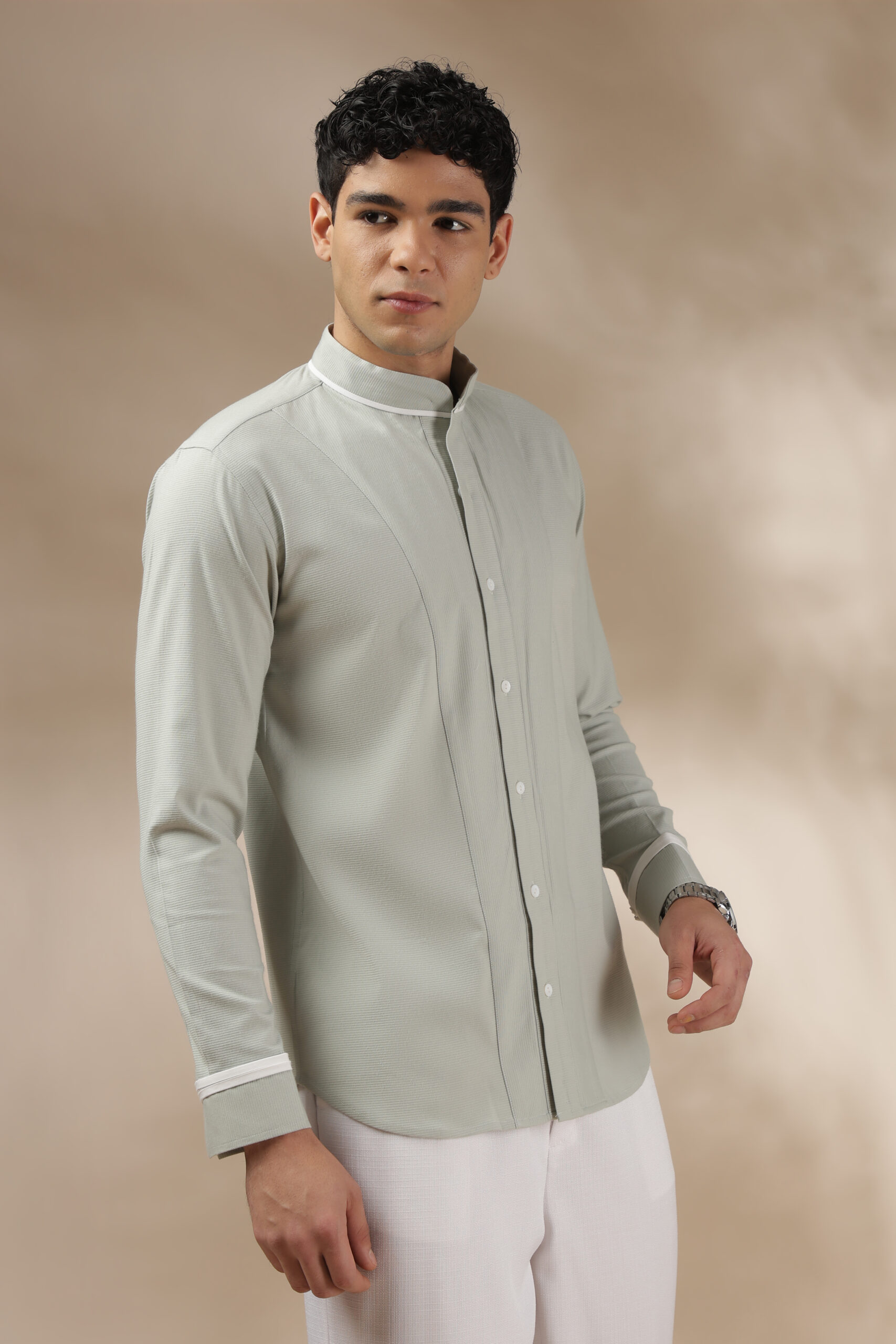 “This is the Elevated Essential Shirt from Weft Lycra for comfort throughout the day. Featuring a relaxed fit and full sleeves, a band collar, a barrel cuff, and contrast white piping. In addition, the shirt has a straight-cut yoke with a box pleat and a contrast tab extension on the cuff. The Elevated Essential Shirt is the perfect shirt for any occasion that requires effortless style. Care: Dry clean only. Lowest heat steam iron preferred.”