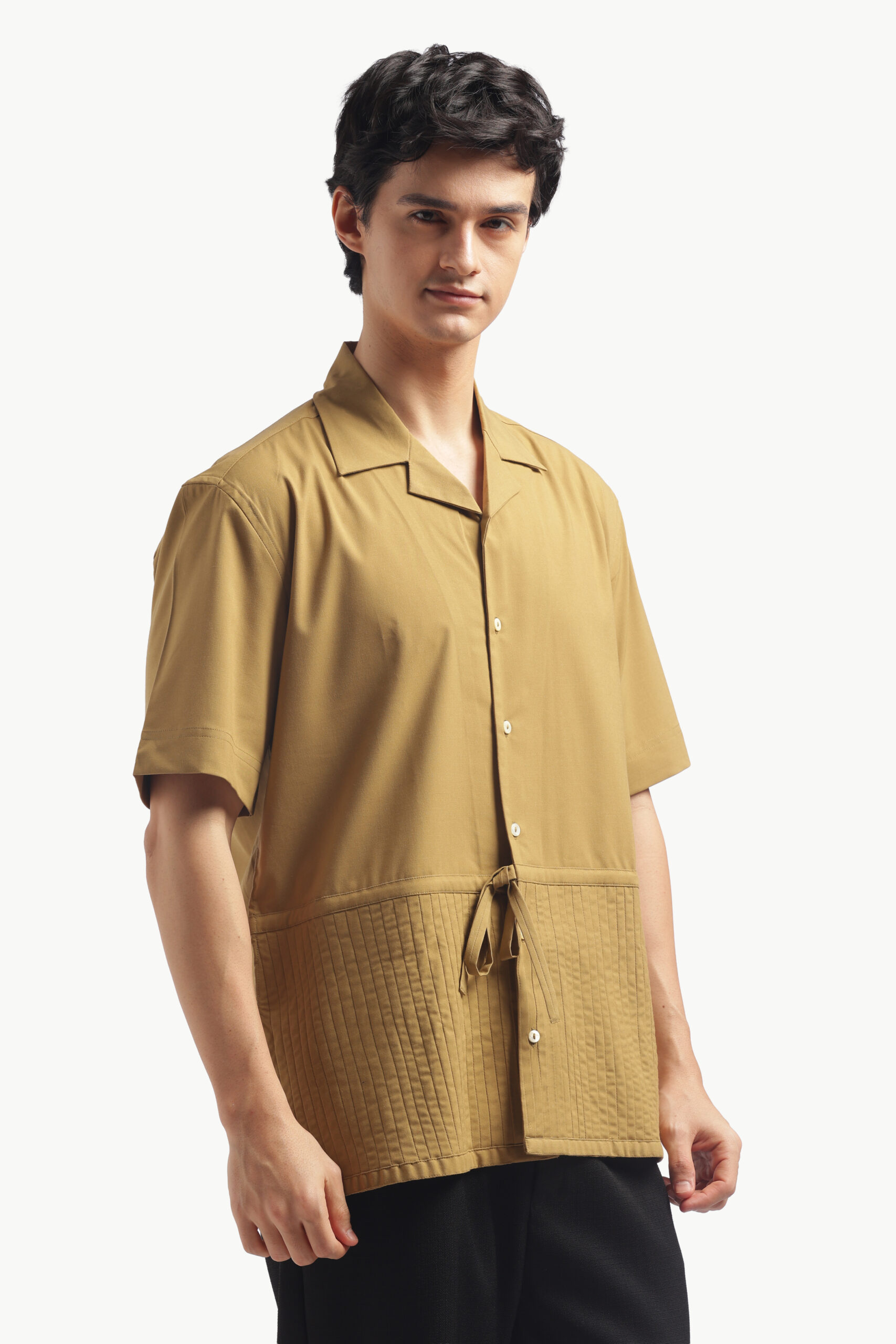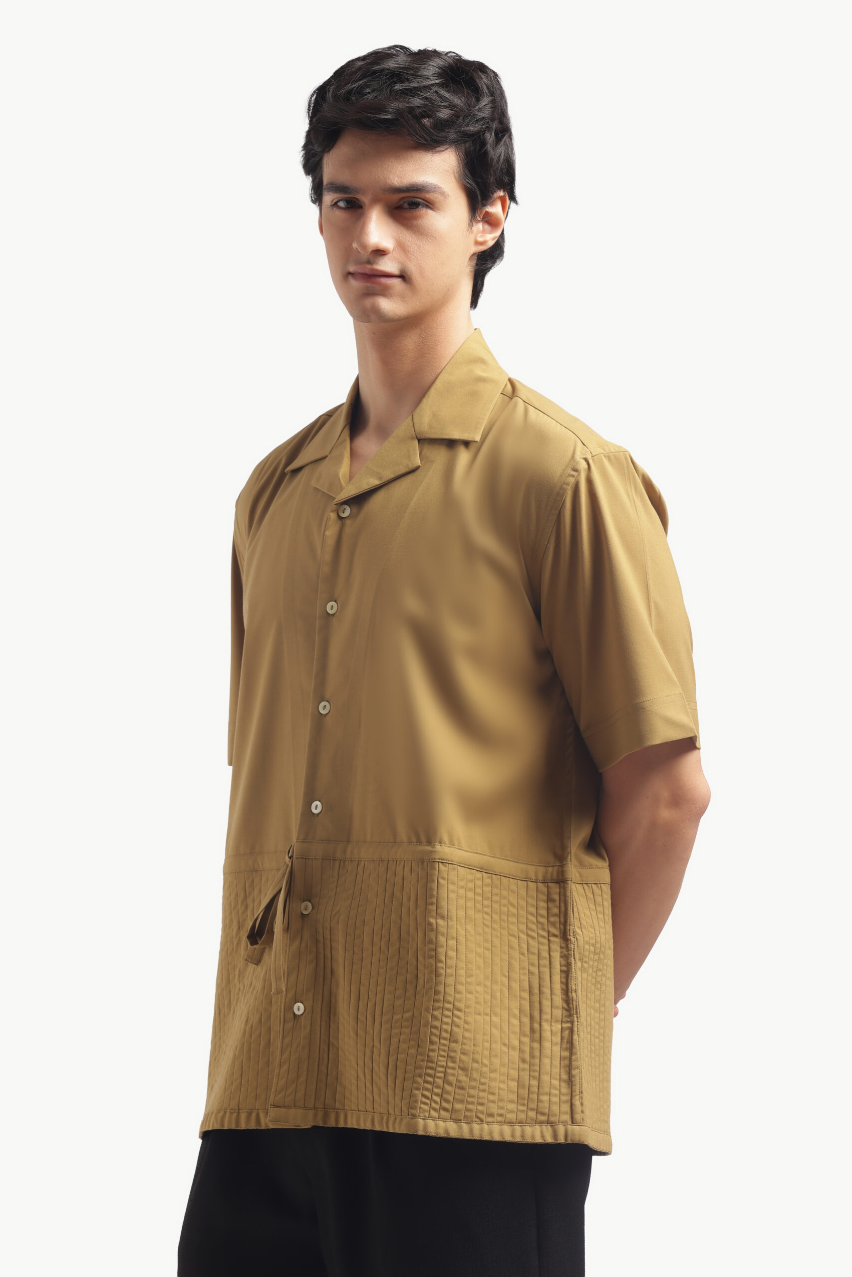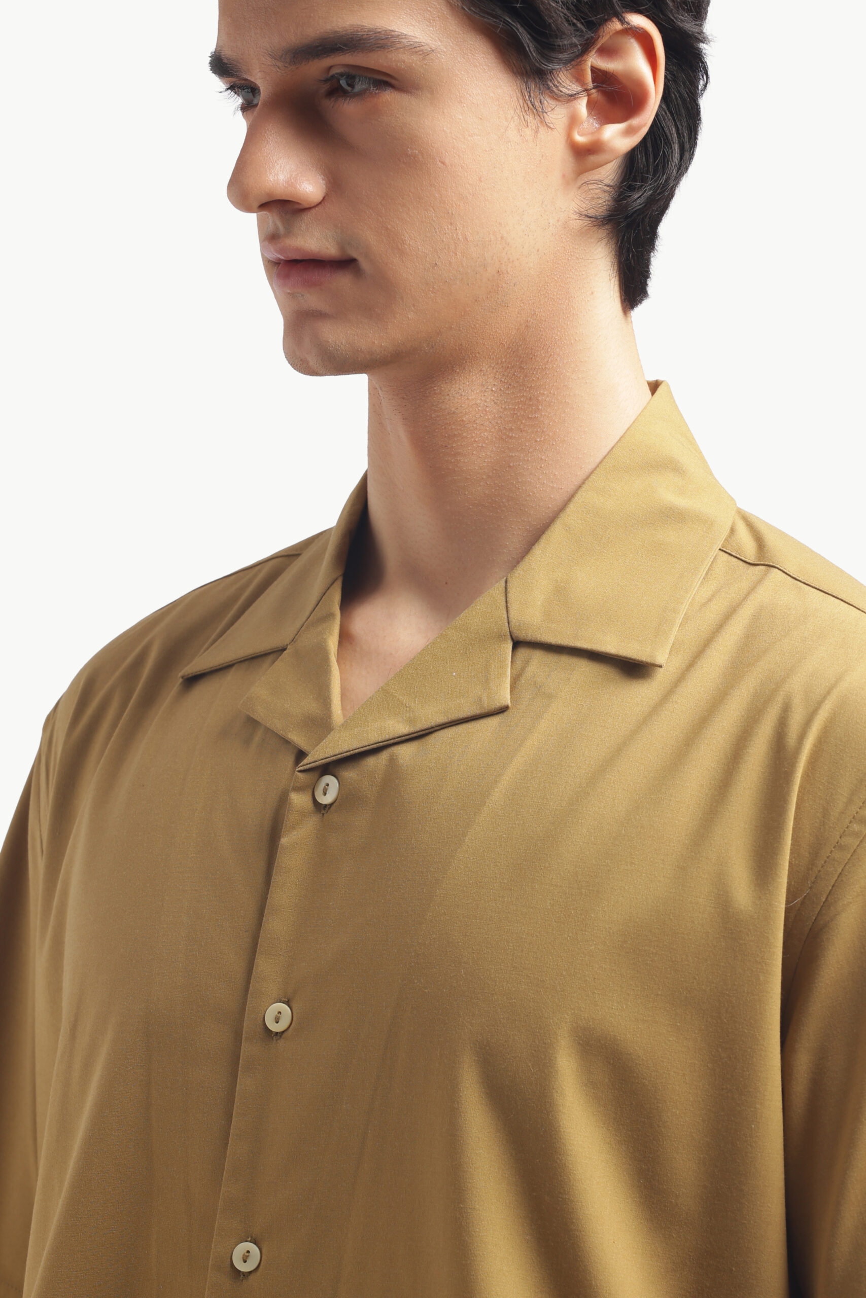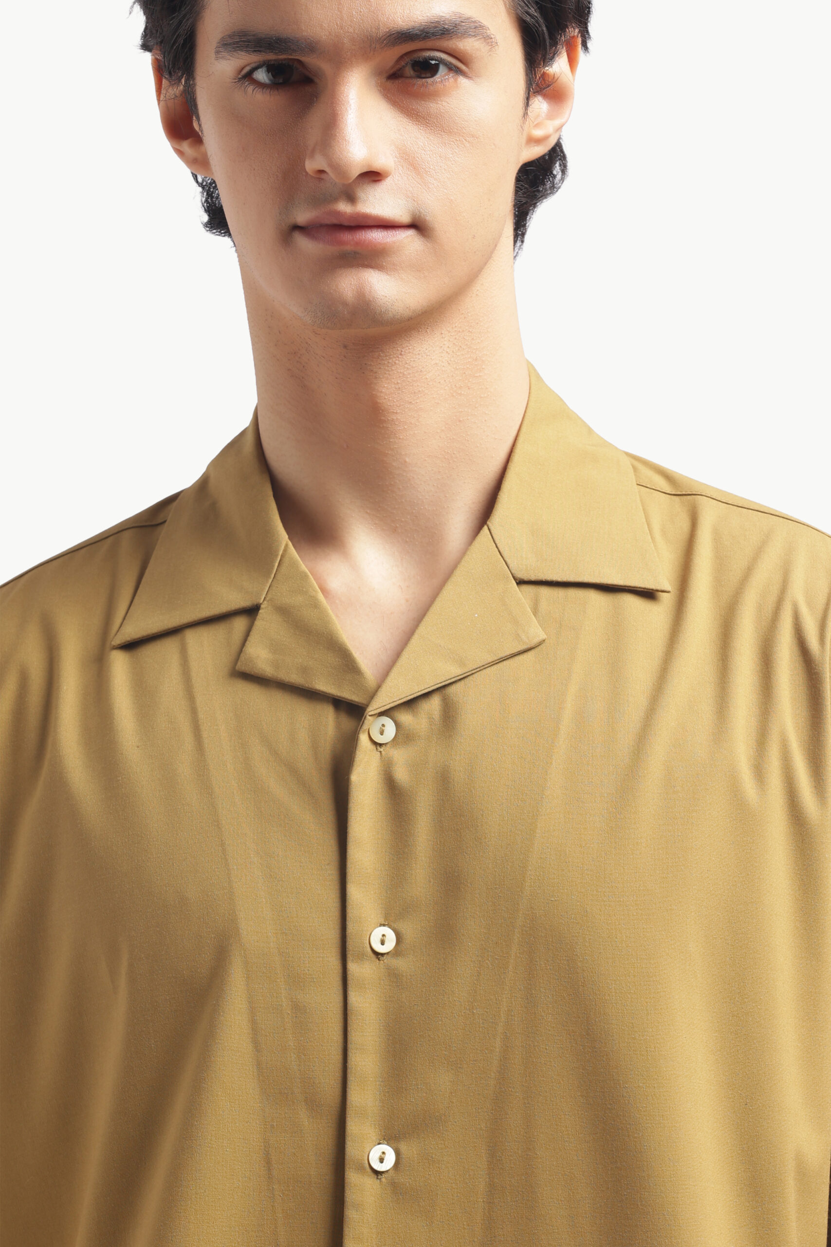 “Upgrade your brunch look with this relaxed-fit Cuban collar shirt in a warm camel brown. Made from imported flat lycra, this shirt has a luxurious feel, is breathable, and wears smooth. The standard button-down placket with short sleeves is casual cool and will keep you comfy on bright low-key days. This shirt has pleats, for a little detail, finished back construction and a straight cut on the yoke. Simple but luxuriously comfortable. Care: Dry clean only. Lowest heat steam iron preferred.”