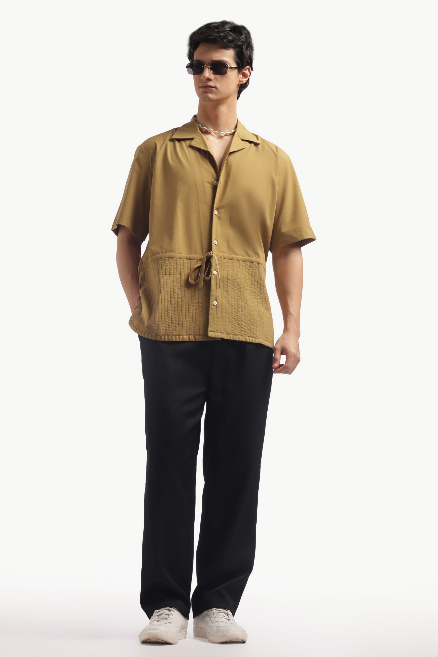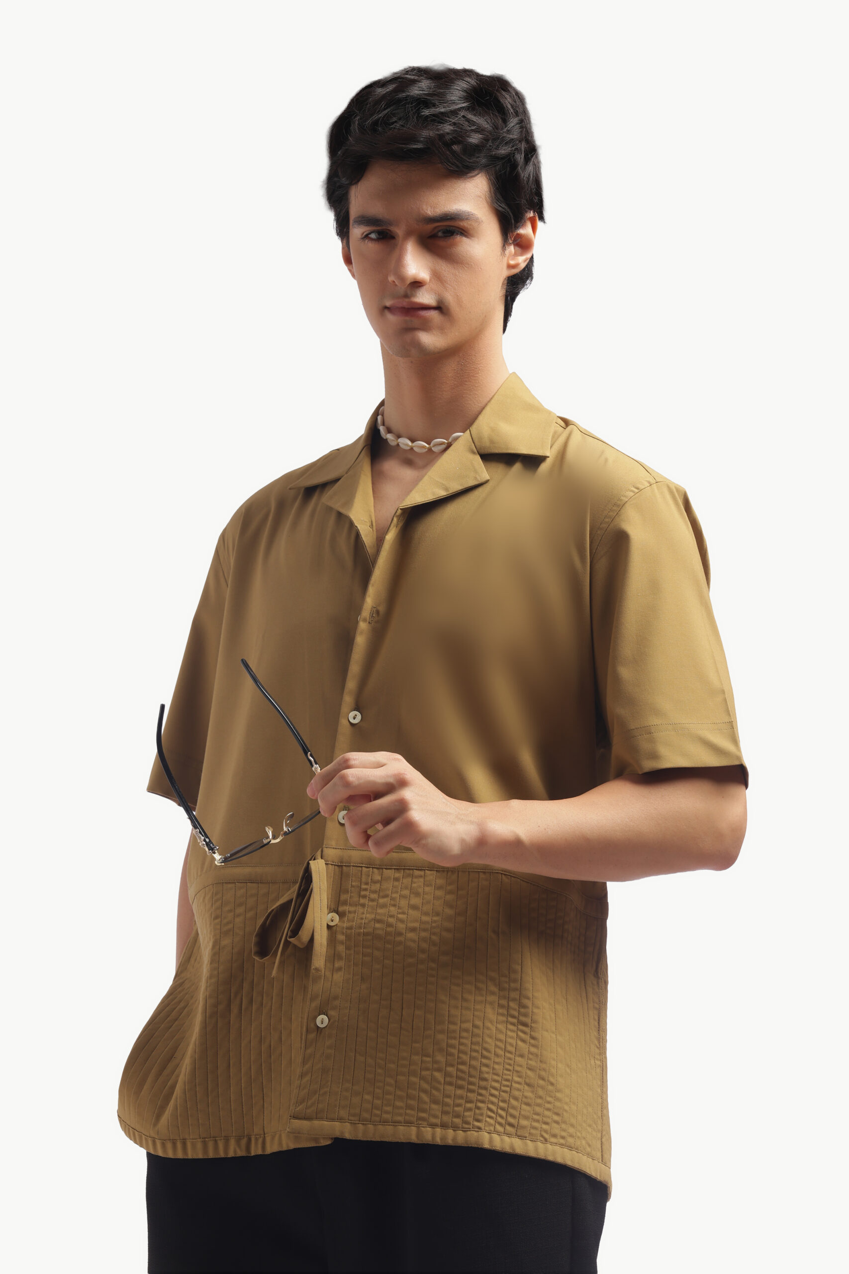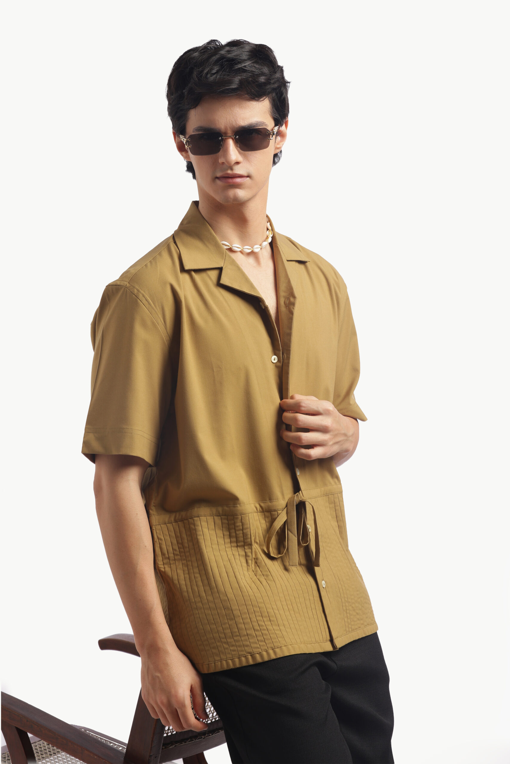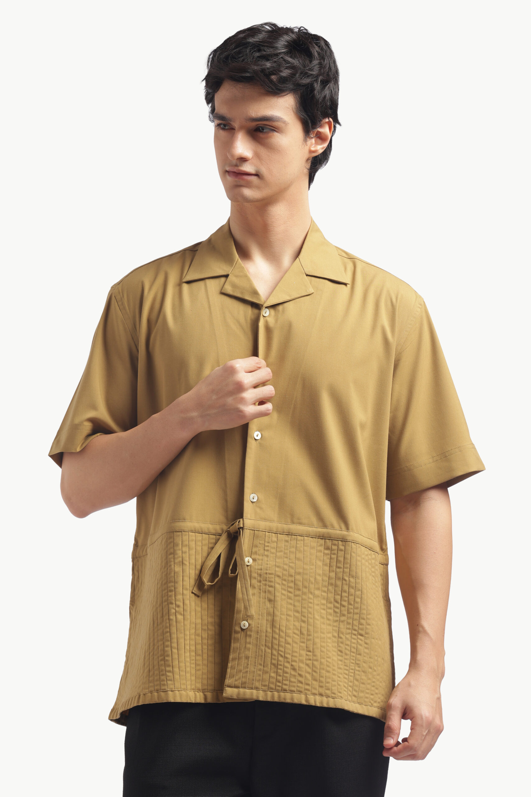 “Upgrade your brunch look with this relaxed-fit Cuban collar shirt in a warm camel brown. Made from imported flat lycra, this shirt has a luxurious feel, is breathable, and wears smooth. The standard button-down placket with short sleeves is casual cool and will keep you comfy on bright low-key days. This shirt has pleats, for a little detail, finished back construction and a straight cut on the yoke. Simple but luxuriously comfortable. Care: Dry clean only. Lowest heat steam iron preferred.”